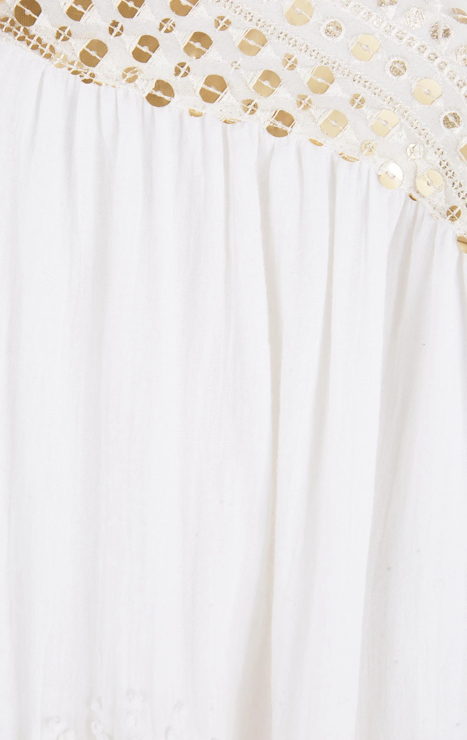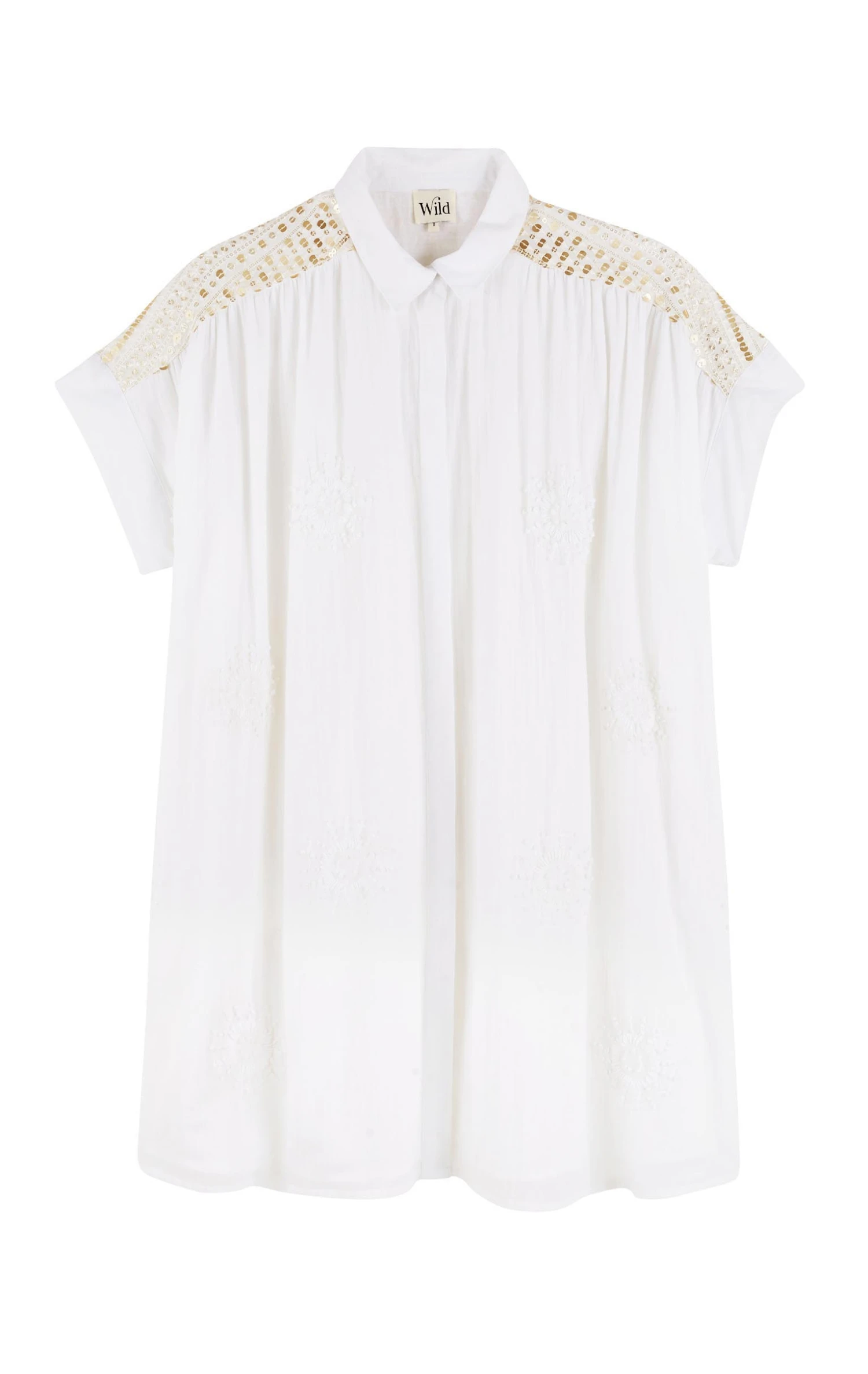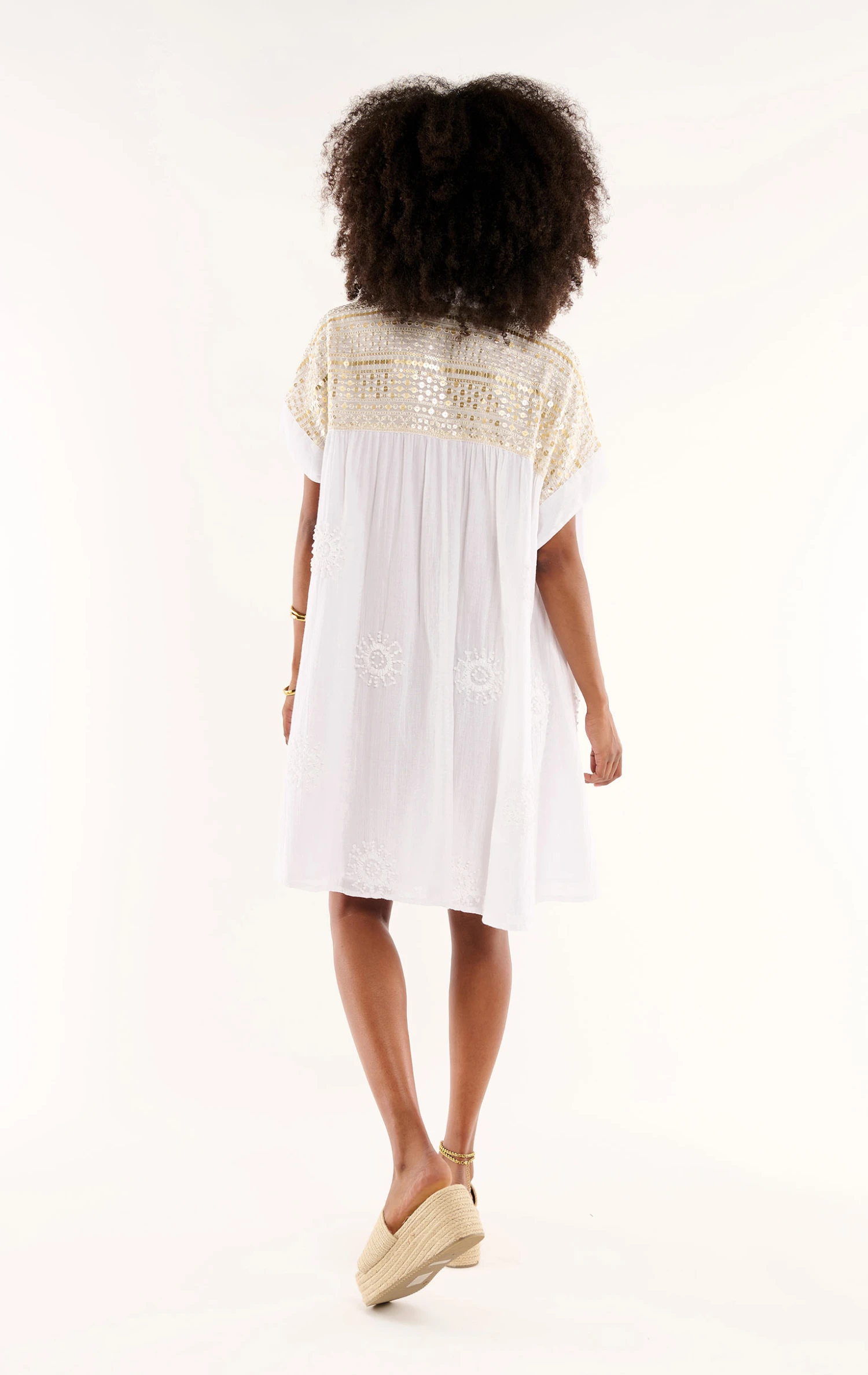 La robe Claire confectionnée dans une gaze de coton légère agrémentée de soleils brodés à la main est une robe chemise, à la coupe joliment oversize. Au niveau des épaules et du dos, un empiècement exceptionnel confectionné d’un voile entièrement brodé de sequins rappelle le rythme travaillé et solaire des bracelets brésiliens.