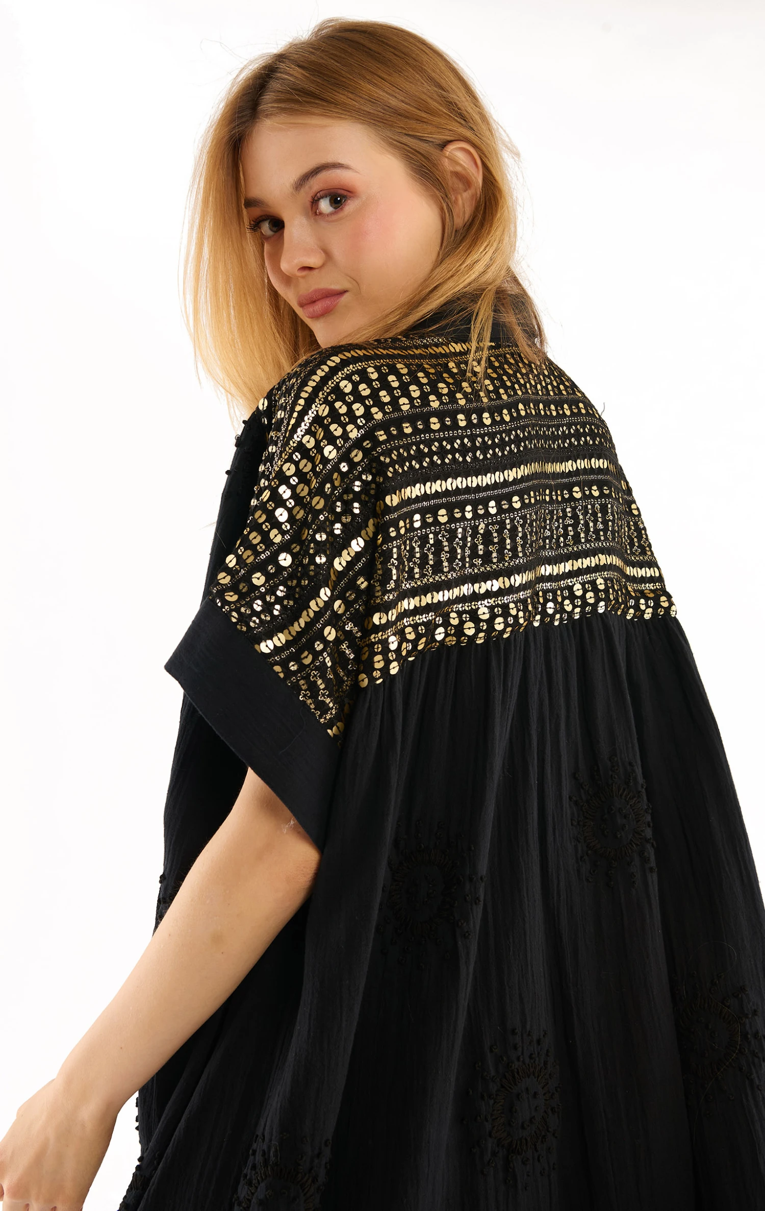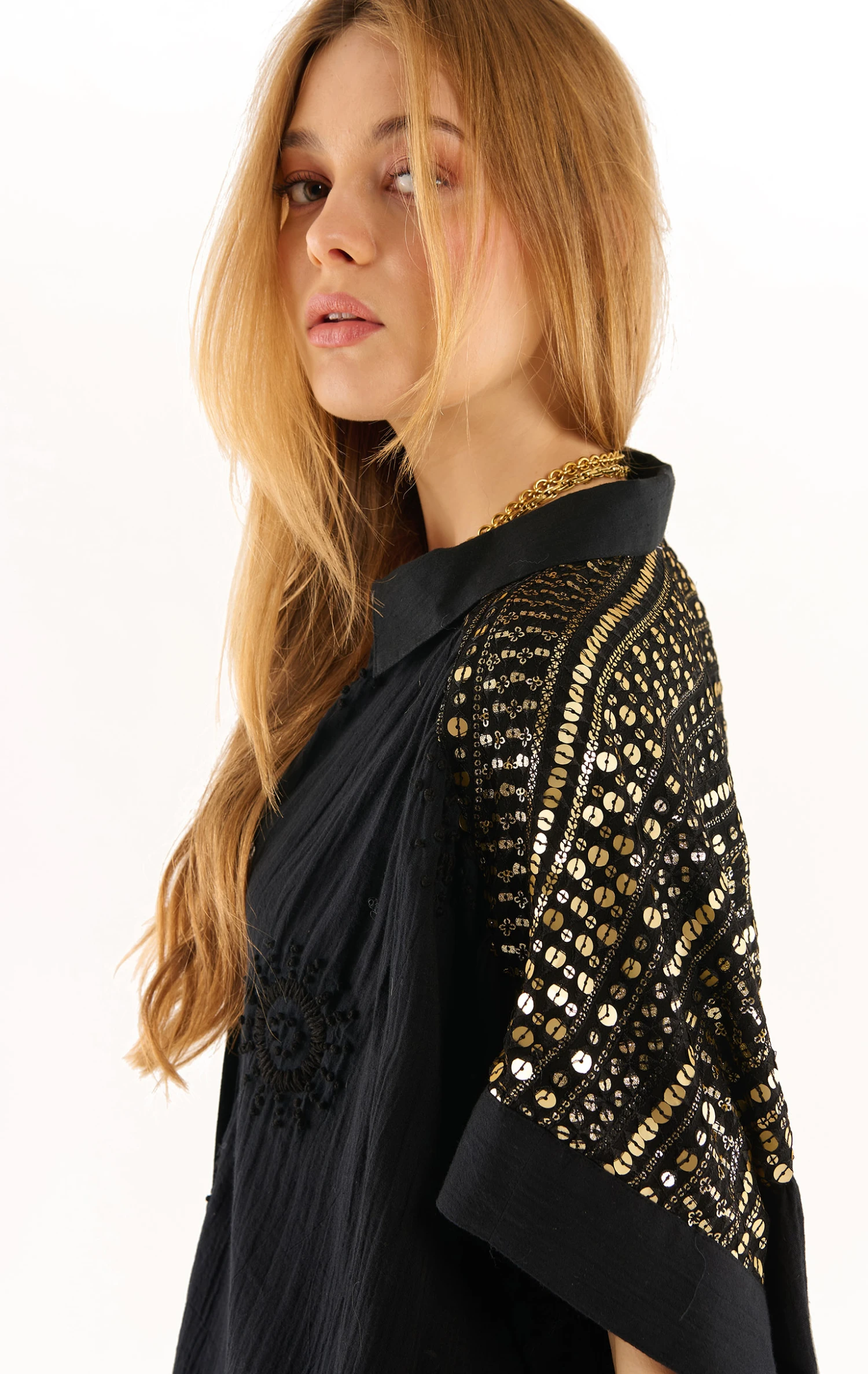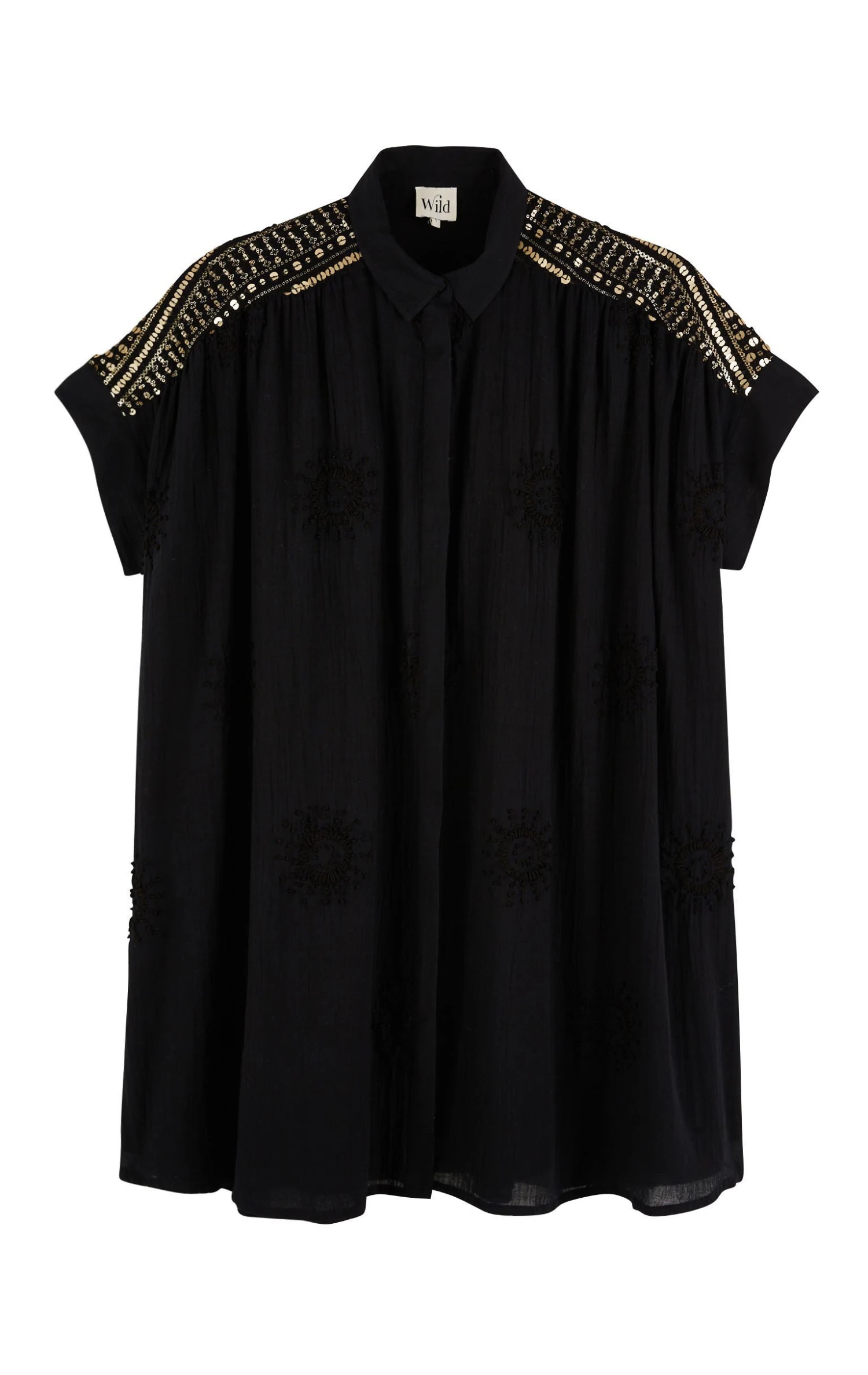 La robe Claire confectionnée dans une gaze de coton légère agrémentée de soleils brodés à la main est une robe chemise, à la coupe joliment oversize. Au niveau des épaules et du dos, un empiècement exceptionnel confectionné d’un voile entièrement brodé de sequins rappelle le rythme travaillé et solaire des bracelets brésiliens.