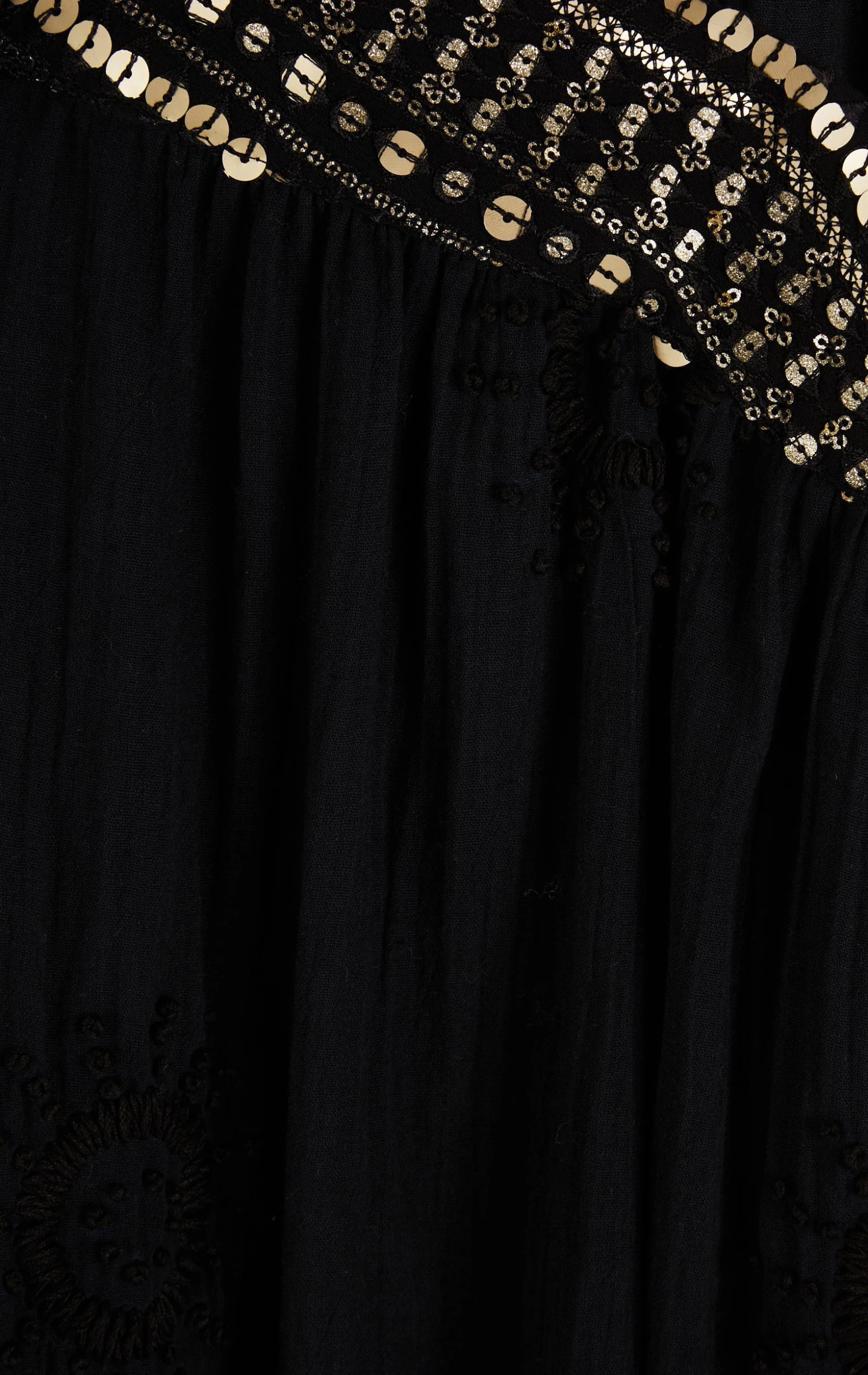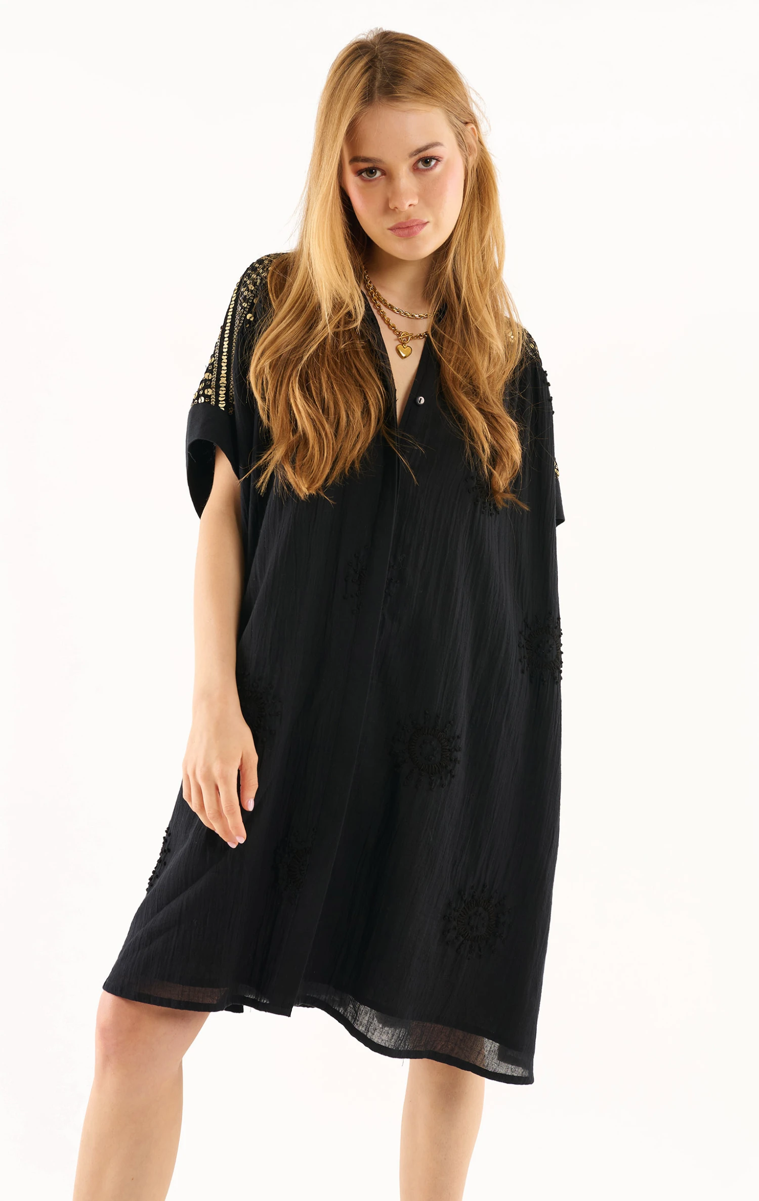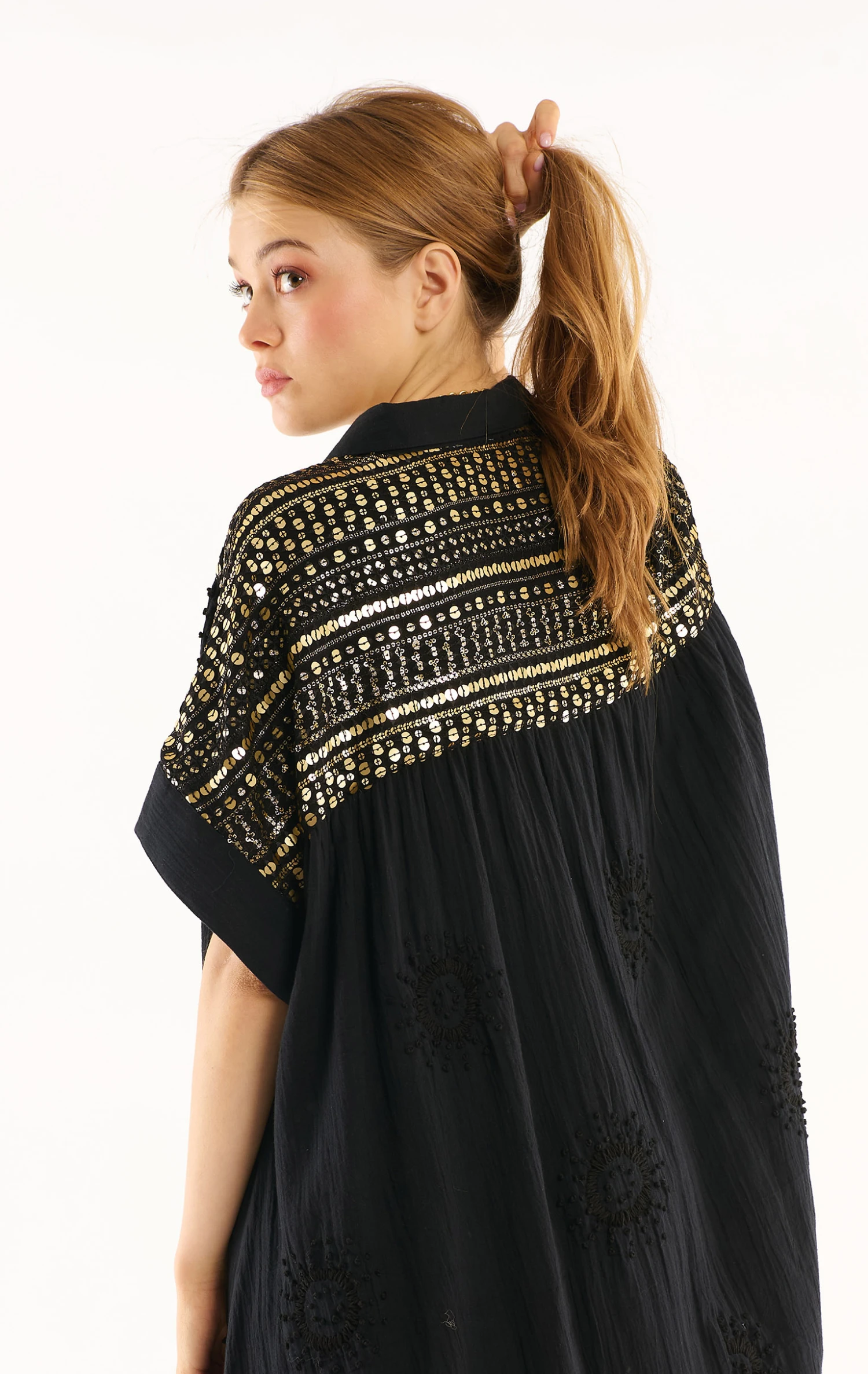 La robe Claire confectionnée dans une gaze de coton légère agrémentée de soleils brodés à la main est une robe chemise, à la coupe joliment oversize. Au niveau des épaules et du dos, un empiècement exceptionnel confectionné d’un voile entièrement brodé de sequins rappelle le rythme travaillé et solaire des bracelets brésiliens.