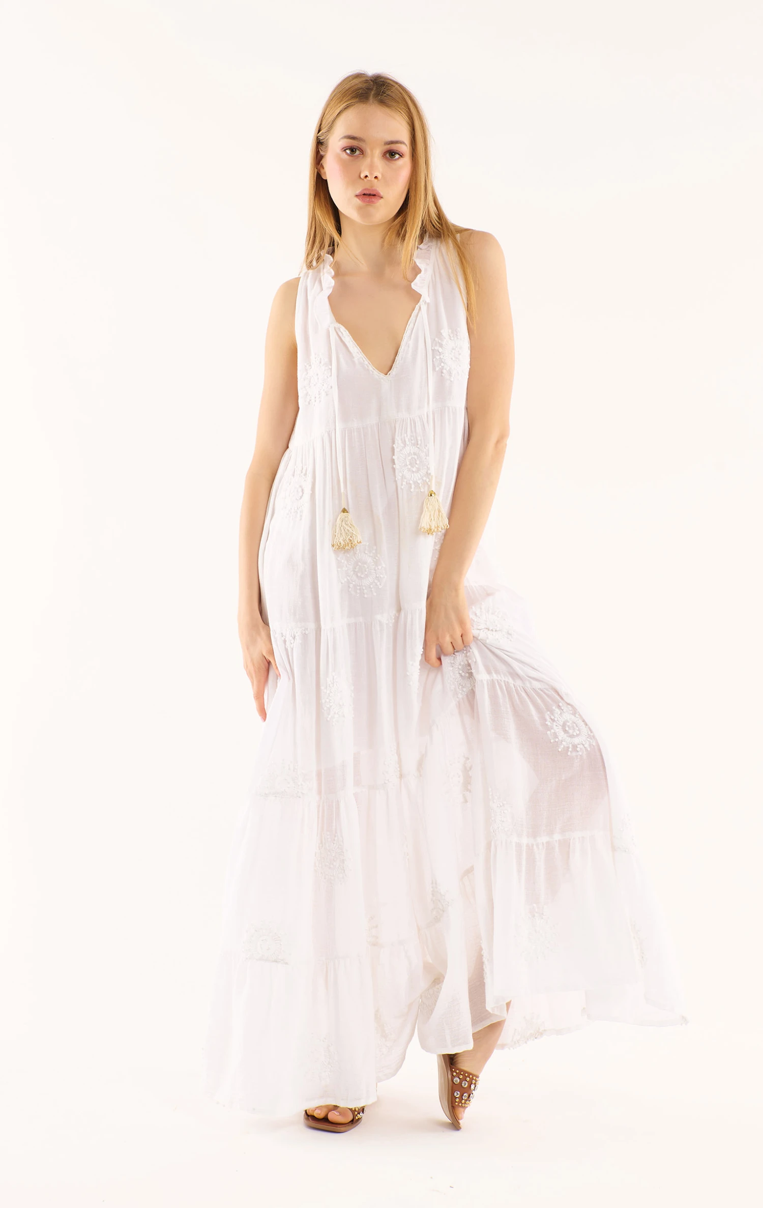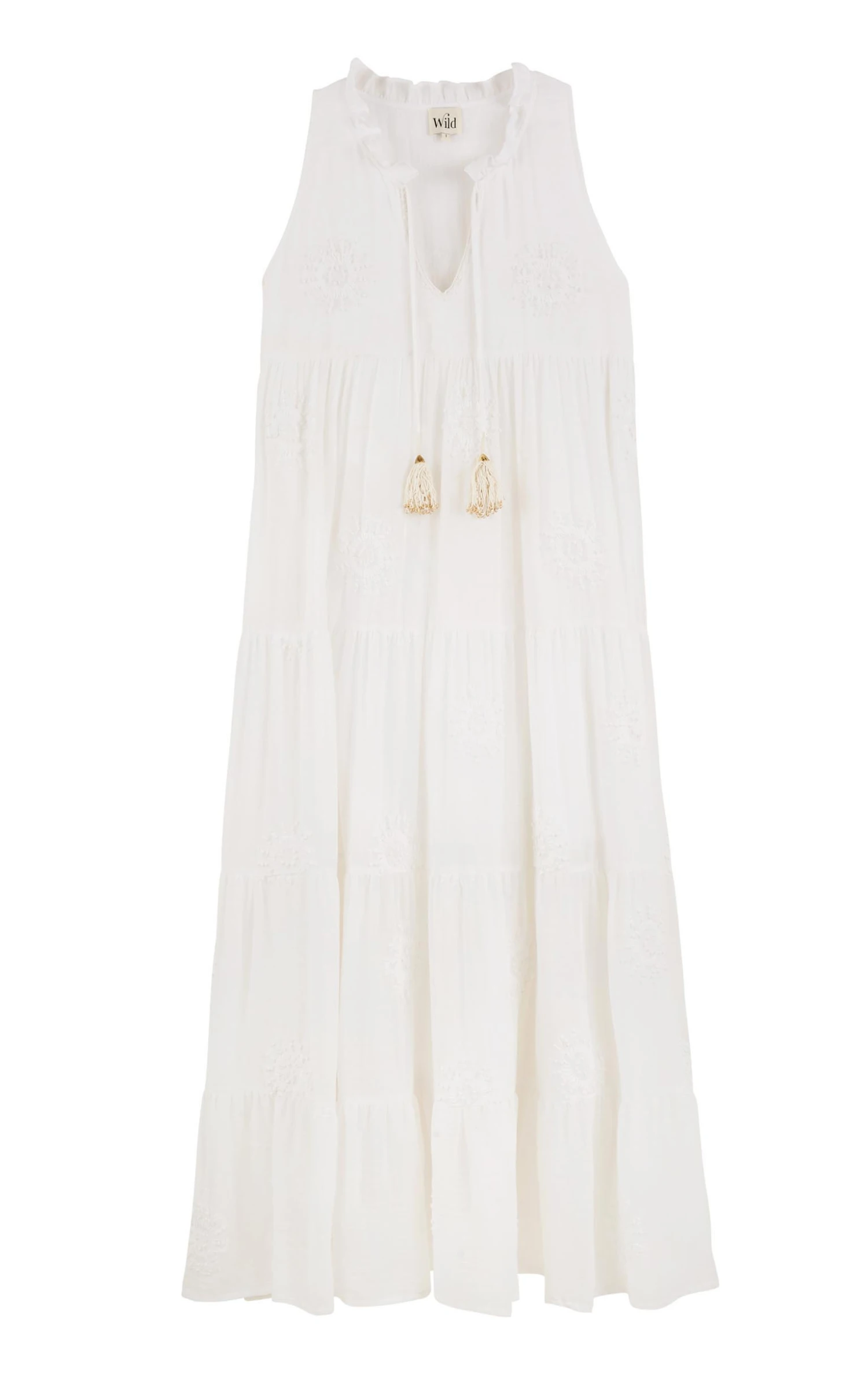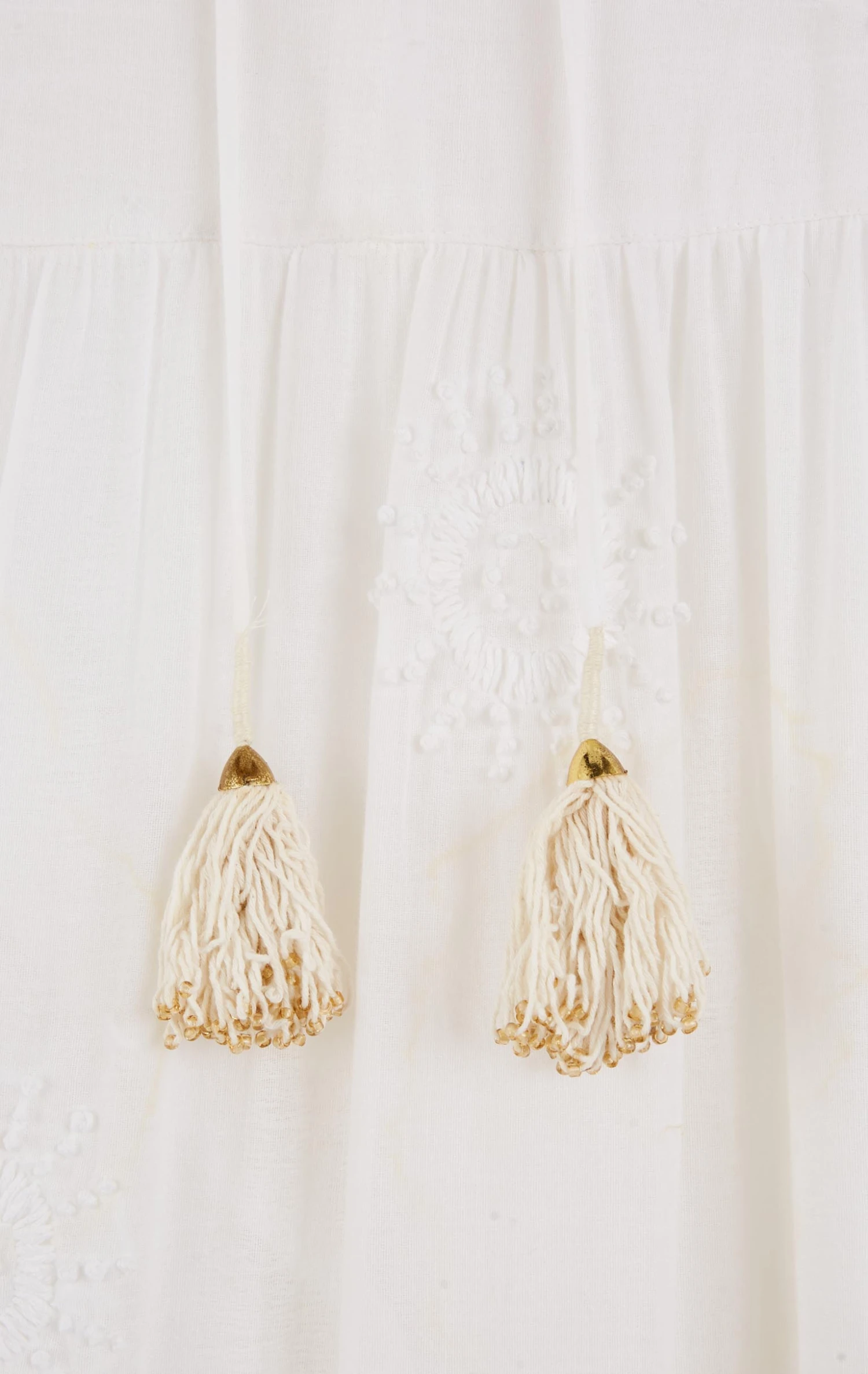 En gaze de coton doublée, délicieusement vaporeuse, la robe Isidore se pare intégralement de soleils luxuriants brodés ton sur ton. Son petit col ouvert minutieusement travaillé sur la partie en V et rehaussé de petits volants au niveau de la nuque lui confère une incroyable féminité. Les deux cordons en coton dont se balancent des pompons en perles de rocaille et les larges pans de tissus aériens qui constituent le jupon apportent une note bohème et estivale à cette pièce exceptionnelle déclinée en deux couleurs, blanche et pêche.