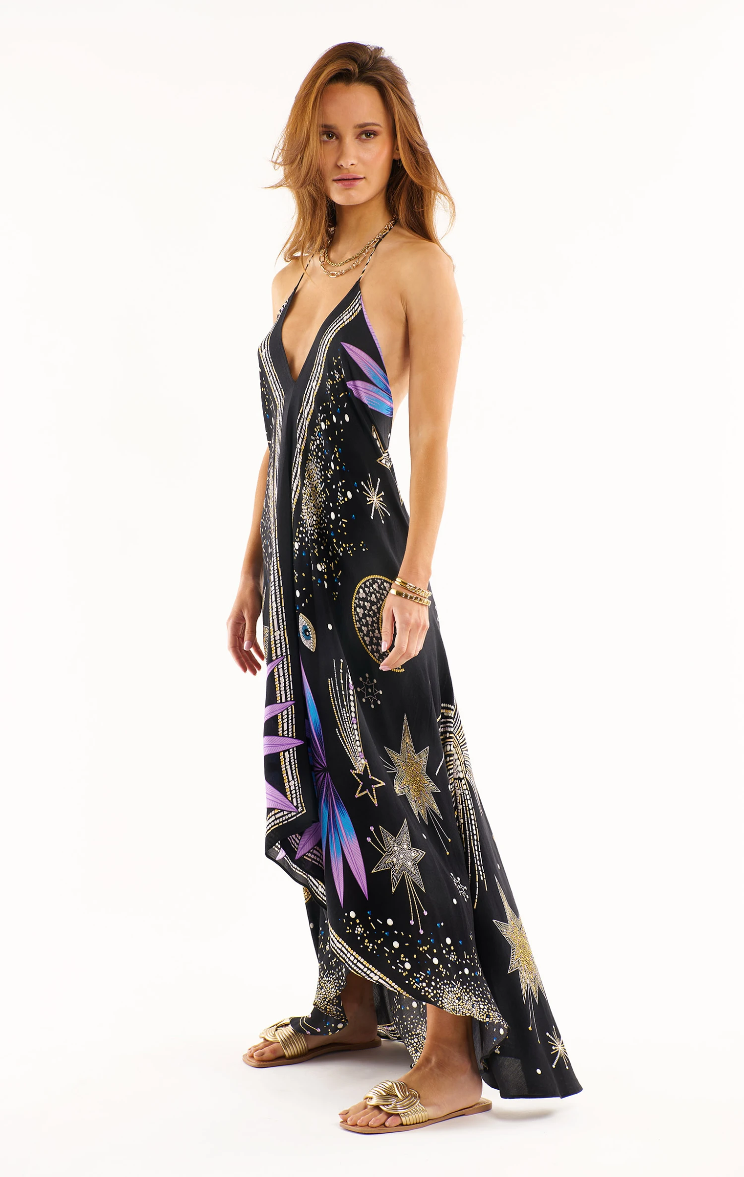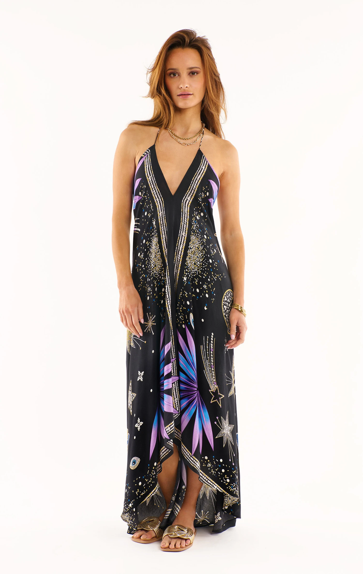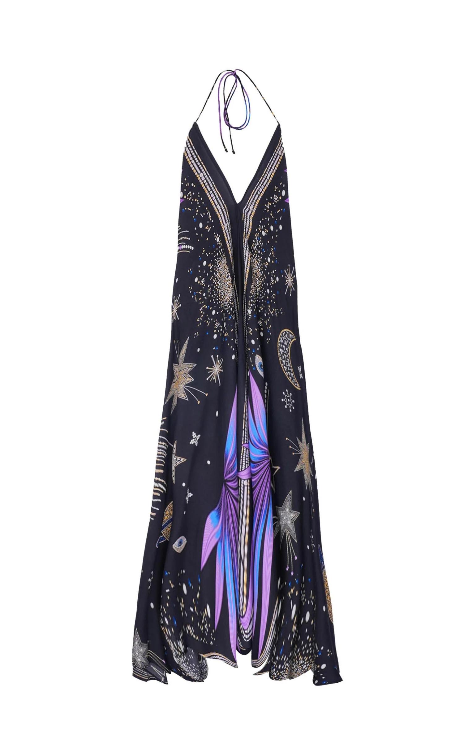 Dessiné entièrement en perles, strass et perles de rocaille, le motif de notre imprimé Comète évoque les bijoux d’HIPANEMA. Des nuances dorées et argentées ponctuées de subtiles touches de bleu et de violet ornent le fond uni noir de notre robe Voilà qui, comme chaque été, détourne avec féminité et panache notre paréo. Nouée derrière la nuque, elle exhibe un décolleté profond et s’enfile très facilement. Sa longueur 7/8ème légèrement asymétrique donne à la longueur de derrière un effet traîne parfait.
