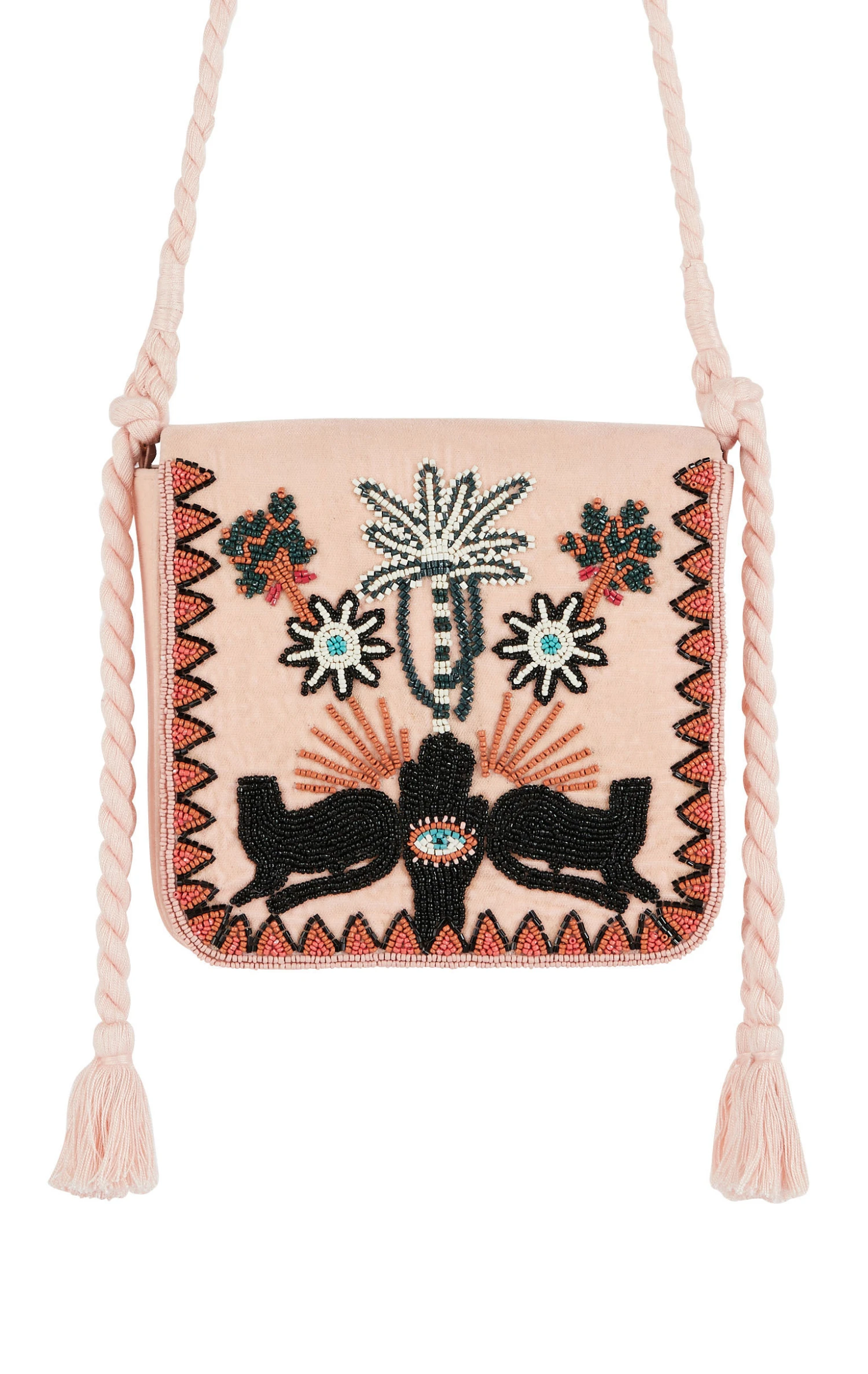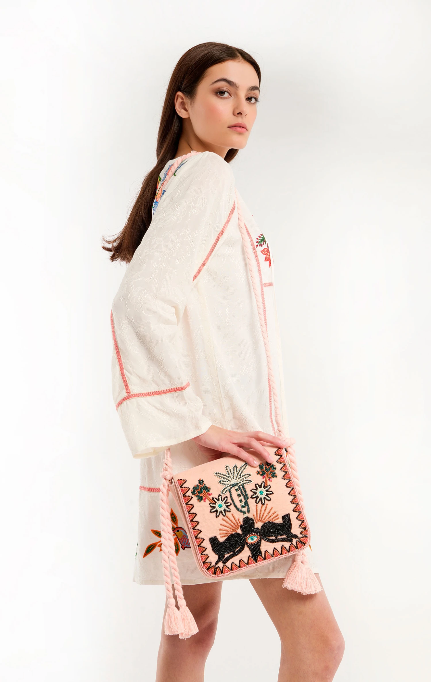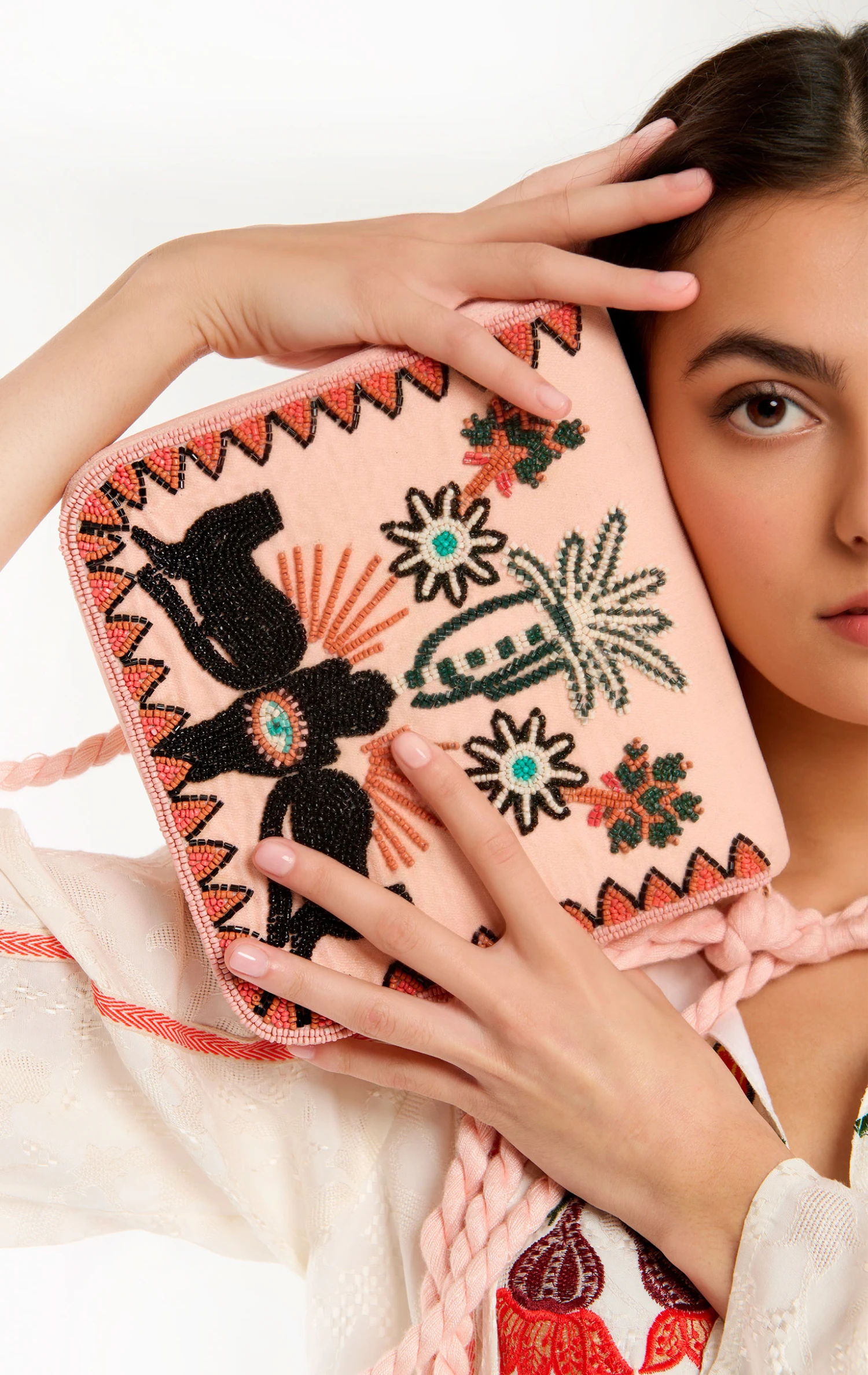 On y retrouve les motifs chers à WILD et emblématiques de notre thème JAIPUR : un palmier, une main protectrice et deux panthères encadrés par une frise aux figures triangulaires brodée de perles de rocaille dans les tons beiges, roses pale, mastique et turquoise. Epona se ferme par une pression sous son rabat et se porte en bandoulière grâce à un joli cordon en coton. Elle se décline en deux couleurs.