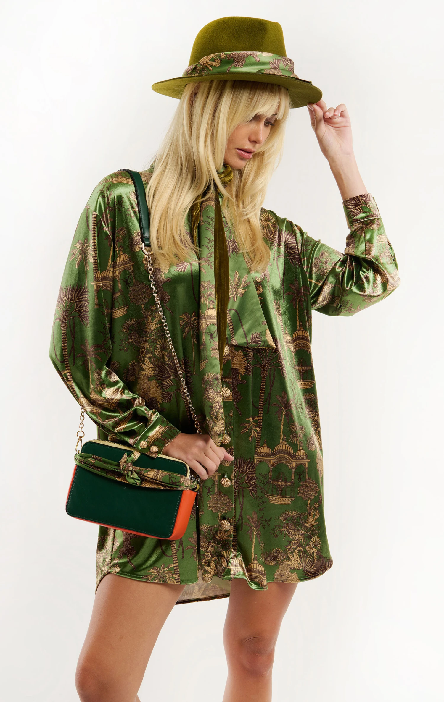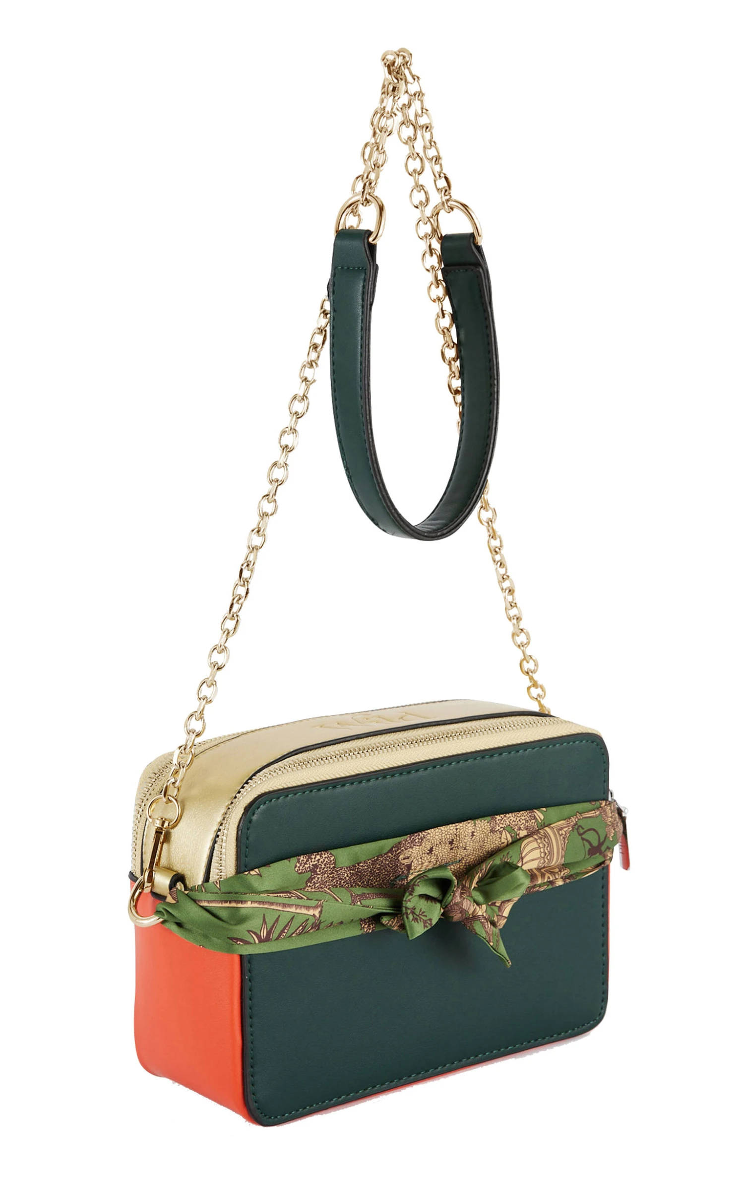 Zoel est un sac à main en faux cuir tricolore qui se pare sur le devant d’un ruban noué aux couleurs des imprimés de notre thème JAIPUR et, à l’exterieur, de deux poches zipées et d’une poche plaquée. Il se décline en 4 couleurs. Il est confectionné ici dans un cuir tricolore vert, doré et orange orné d’un foulard noué sur le devant dans les couleurs de l’imprimé Kaki de la robe JAYA du thème JAIPUR. Porté en bandoulière grâce à sa chaîne dorée amovible, Zoel est l’accessoire très mode qu’on chérira toute la saison !