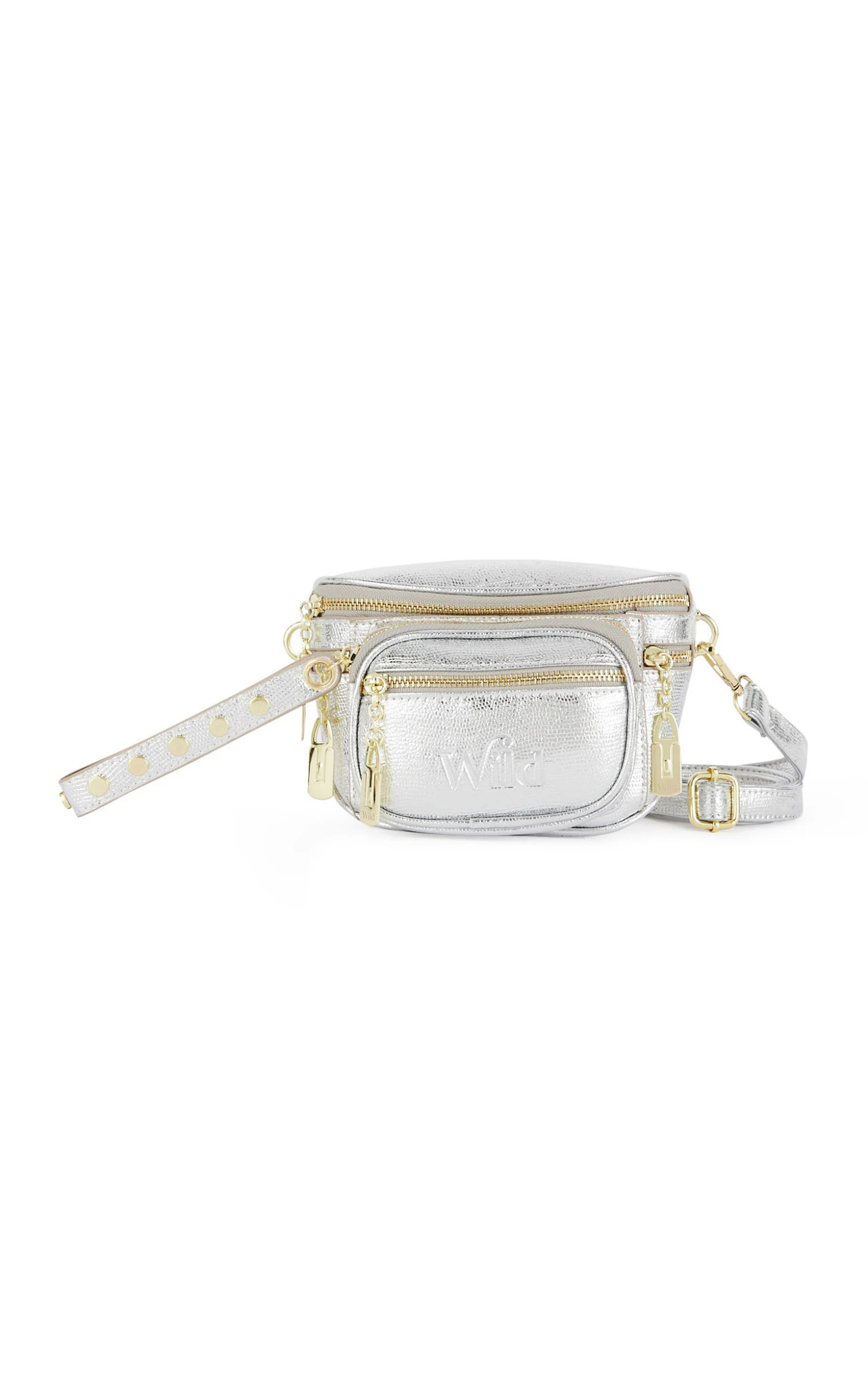 Accessoire de prédilection chez WILD, la banane revient cette saison entièrement irisée, confectionné dans un faux cuir métallique à la texture subtilement lezard. Son volume ample et ses poches zipées multiples permettent une utilisation facile et très pratique; on la porte à la taille ou en bandoulière grâce à sa anse ammovible. Déclinée en 5 couleurs, elle est ici argentée.