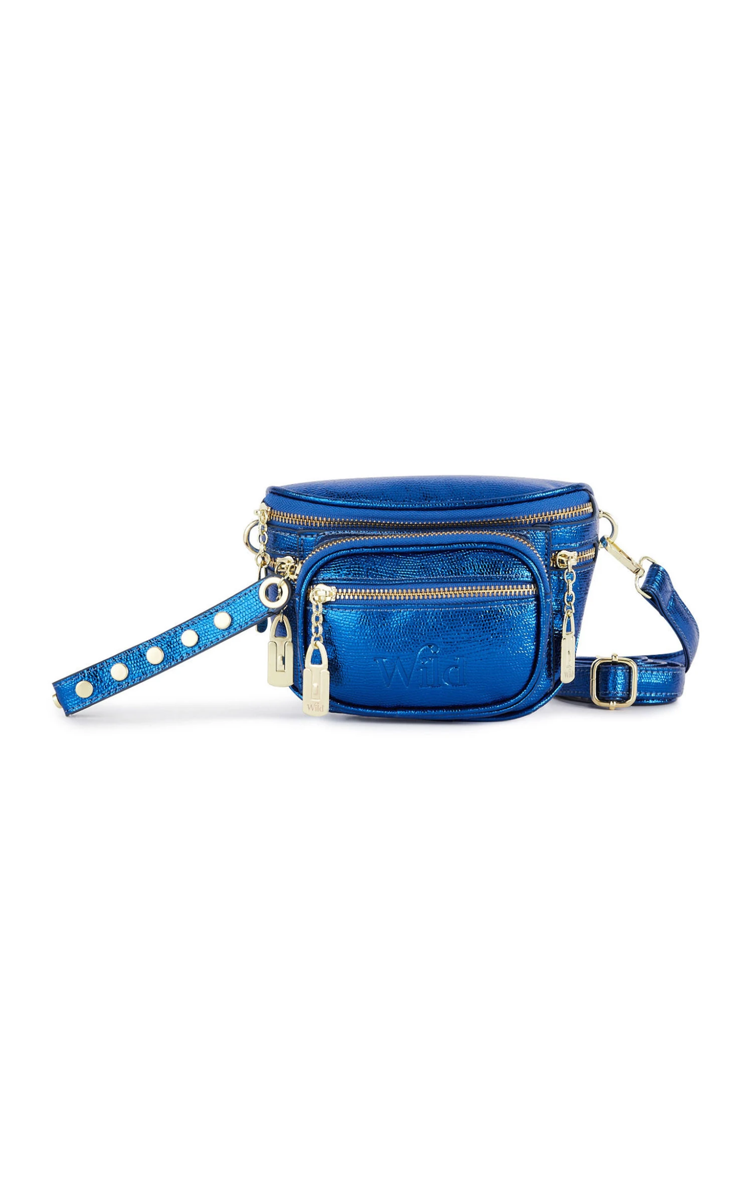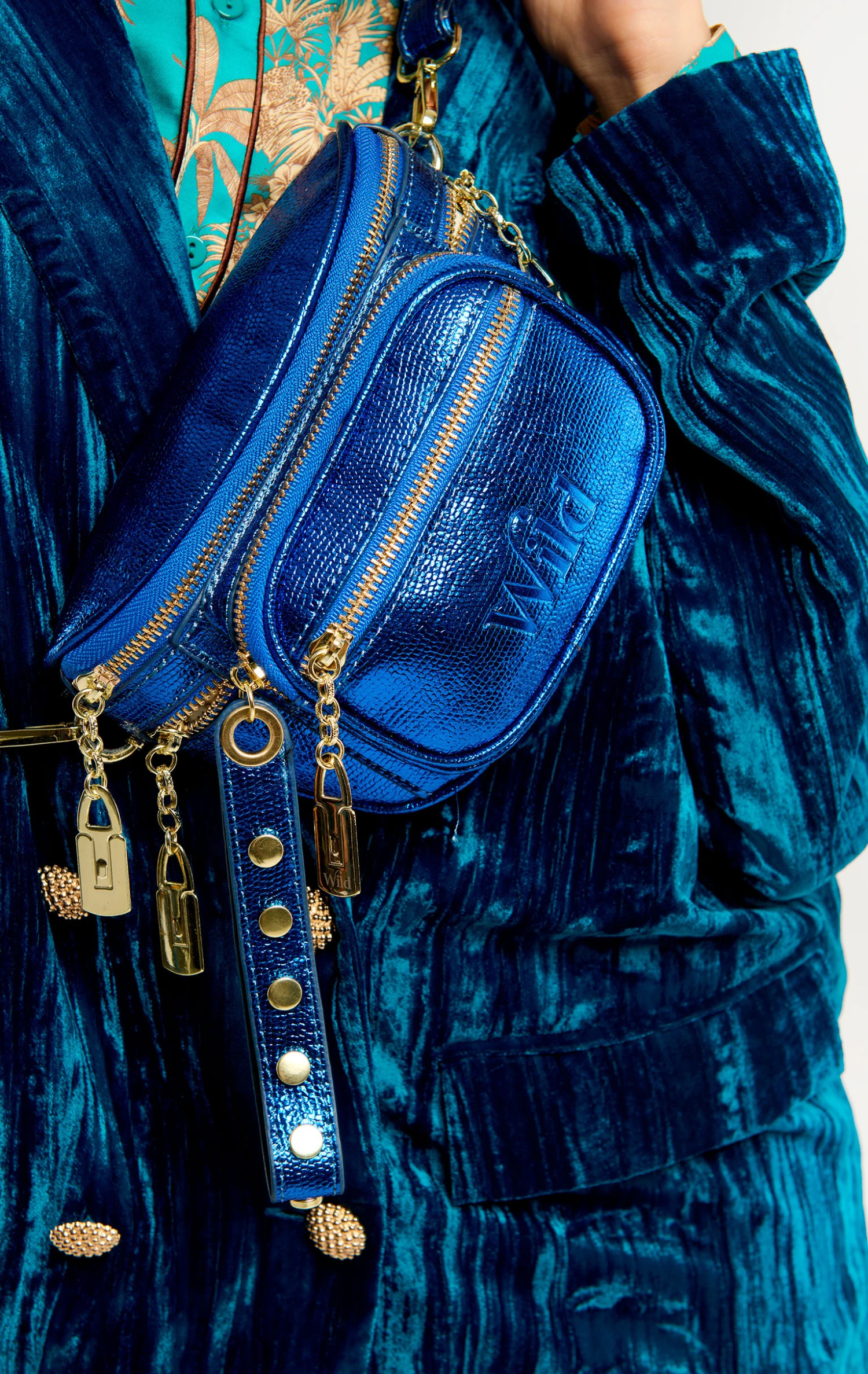 Accessoire de prédilection chez WILD, la banane revient cette saison entièrement irisée, confectionné dans un faux cuir métallique à la texture subtilement lezard. Son volume ample et ses poches zipées multiples permettent une utilisation facile et très pratique; on la porte à la taille ou en bandoulière grâce à sa anse ammovible. Déclinée en 5 couleurs, elle est ici en bleu Klein vif.