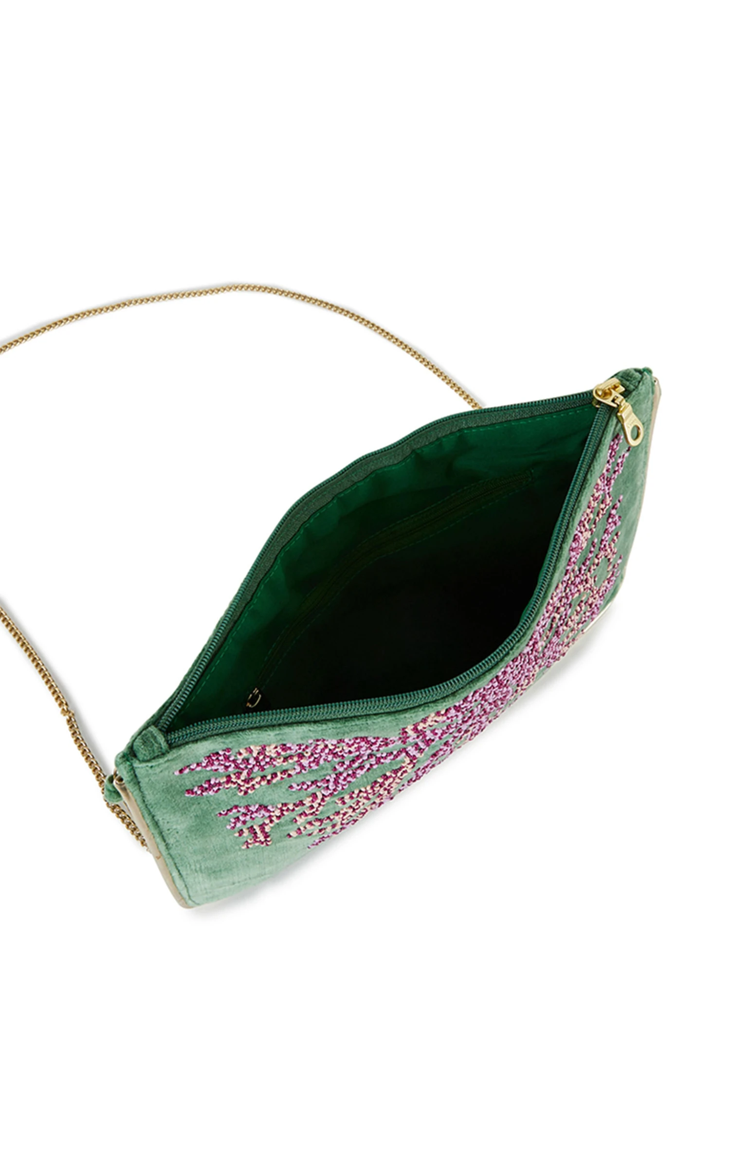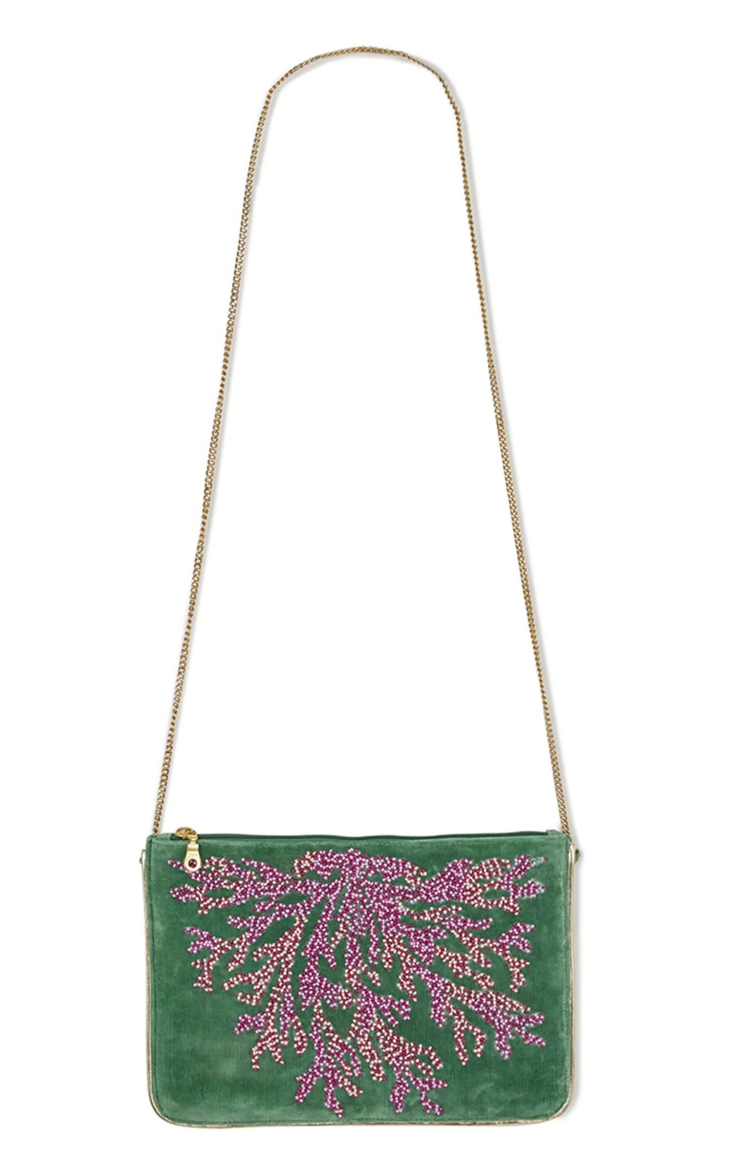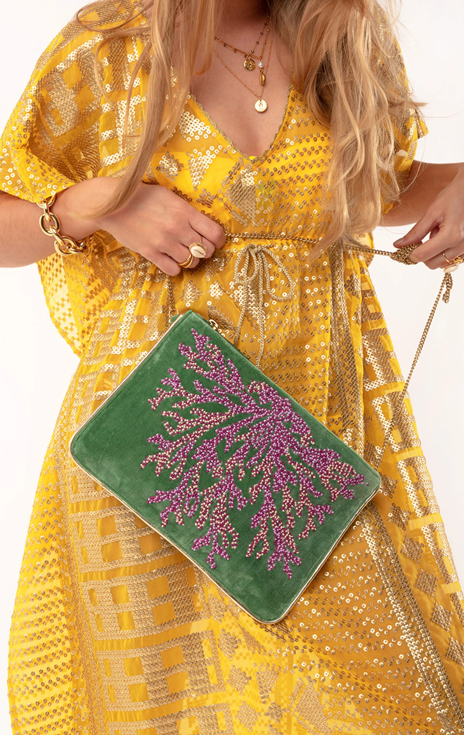 Élégante pochette clin d’œil aux fonds marins. Sur fond velours vert, elle est ornée d’un motif corail entièrement brodé à la main de perles nacrées blanches, avec des tons de noir, de fuchsia, de parme, de crème. Porté pochette ou bandoulière avec sa chaîne, elle est munie d’une fermeture zippée et d’une poche intérieure. Pour les oiseaux de jour et les belles de nuit.