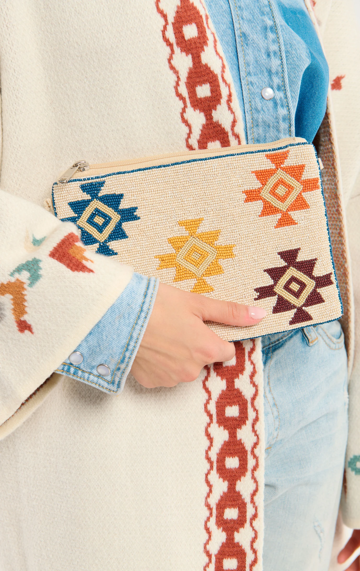 Cette pochette zippée est entièrement perlés. Pour la version blanche le fond est brodé de perles de rocaille blanches avec des motifs aux tons bleus, acier, jaunes, oranges et bordeaux. On adore l’idée que cette pochette rehaussera, avec élégance, un jean ou une maille.