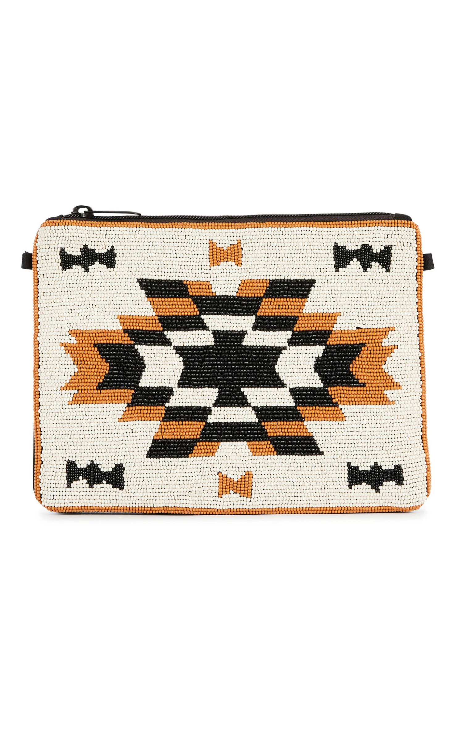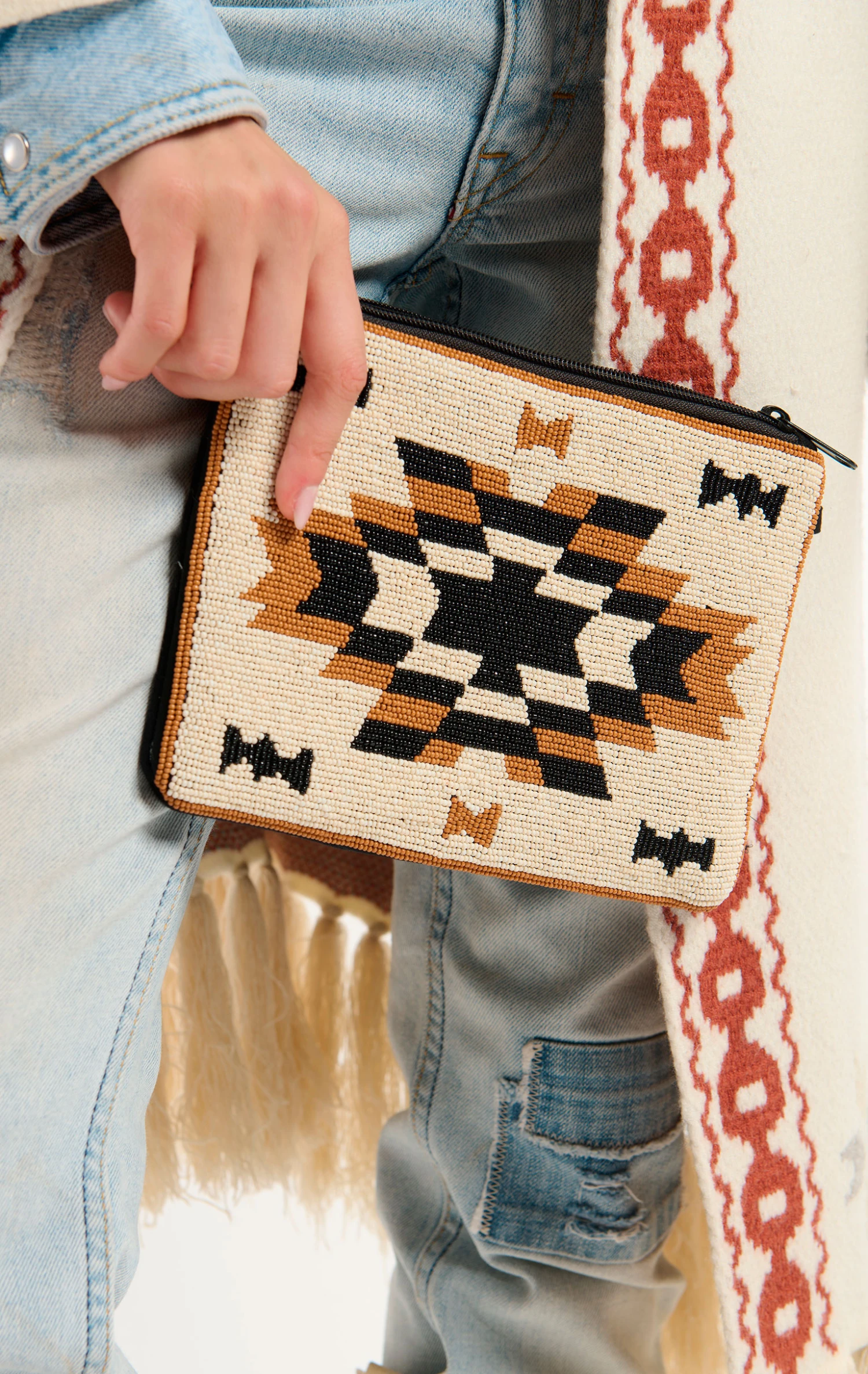 Cette pochette zippée est entièrement perlés. Pour la déclinaison noire, le fond est brodé de perles de rocaille ocres avec des motifs aux tons caramel et noirs. On adore l’idée que cette pochette rehaussera, avec élégance, un jean ou une maille.