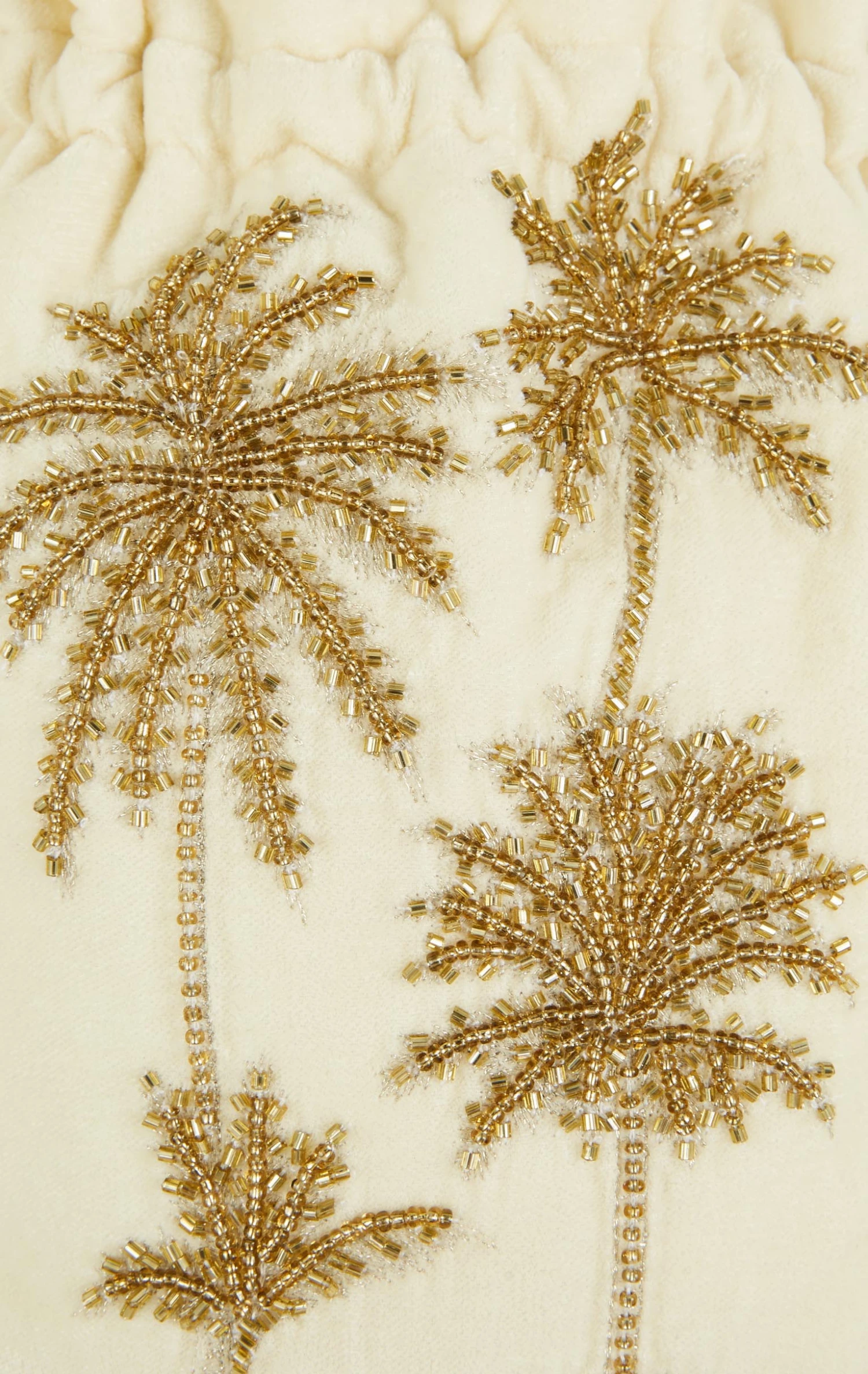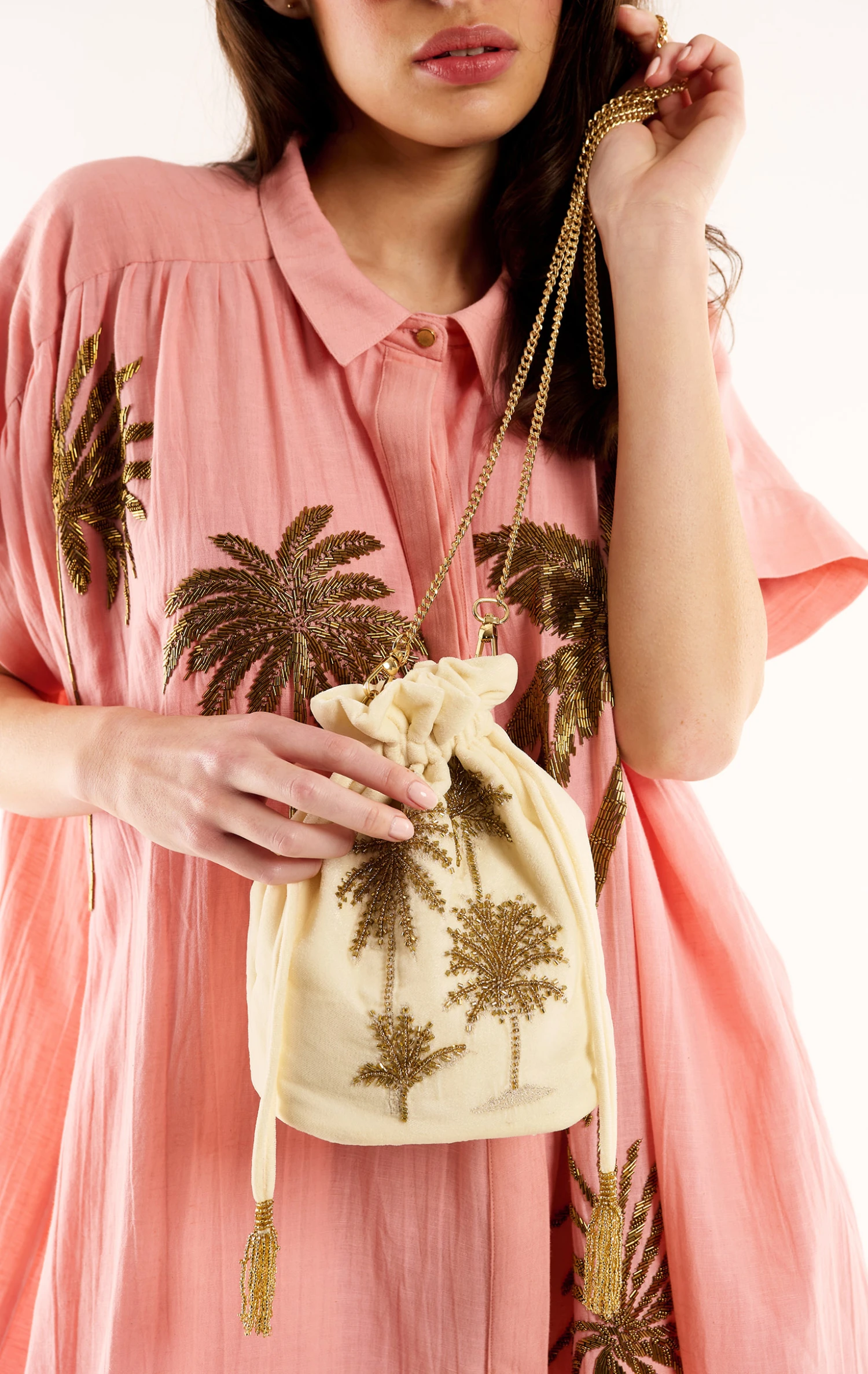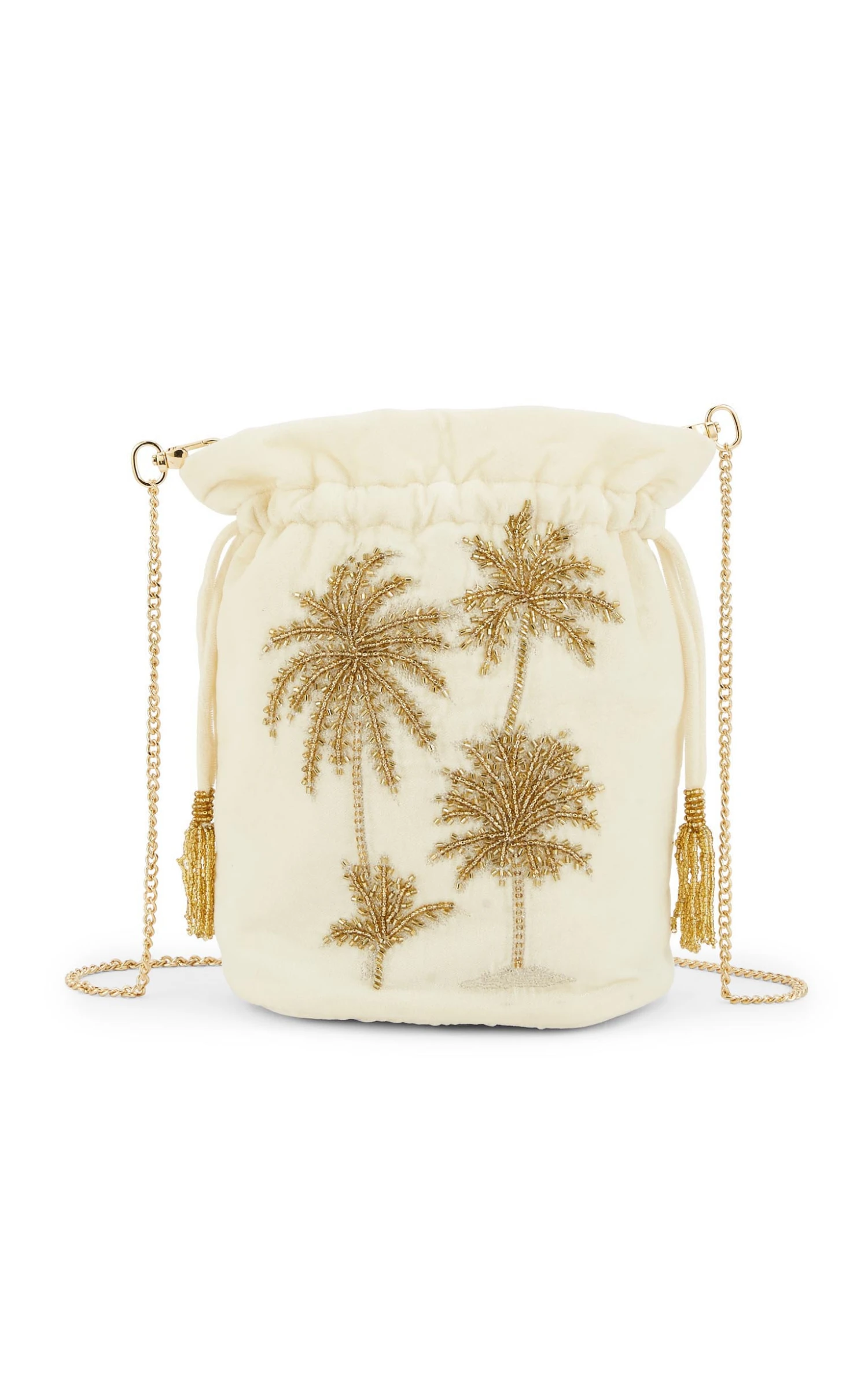 Notre sac Aphelios est un sac seau, retravaillé autour d’une forme bourse, qui se porte en bandoulière grâce à une précieuse chaîne dorée. Sur un fond en velours blanc lumineux, se dessinent nos magnifiques palmiers, entièrement brodés de perles dorées. Aphelios se ferme grâce à des cordons que l’on resserre et qui se terminent par d’exquises petites perles dorées pour parfaire ainsi le caractère iconique de cet accessoire parfait.