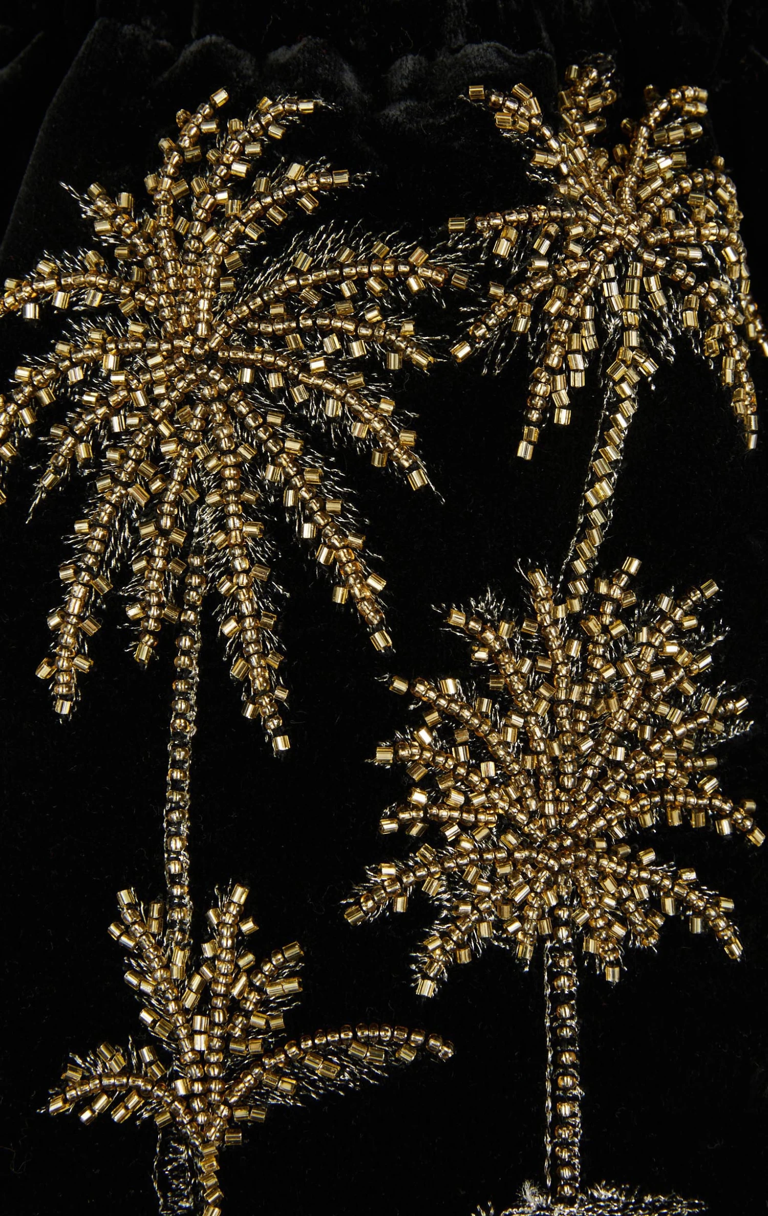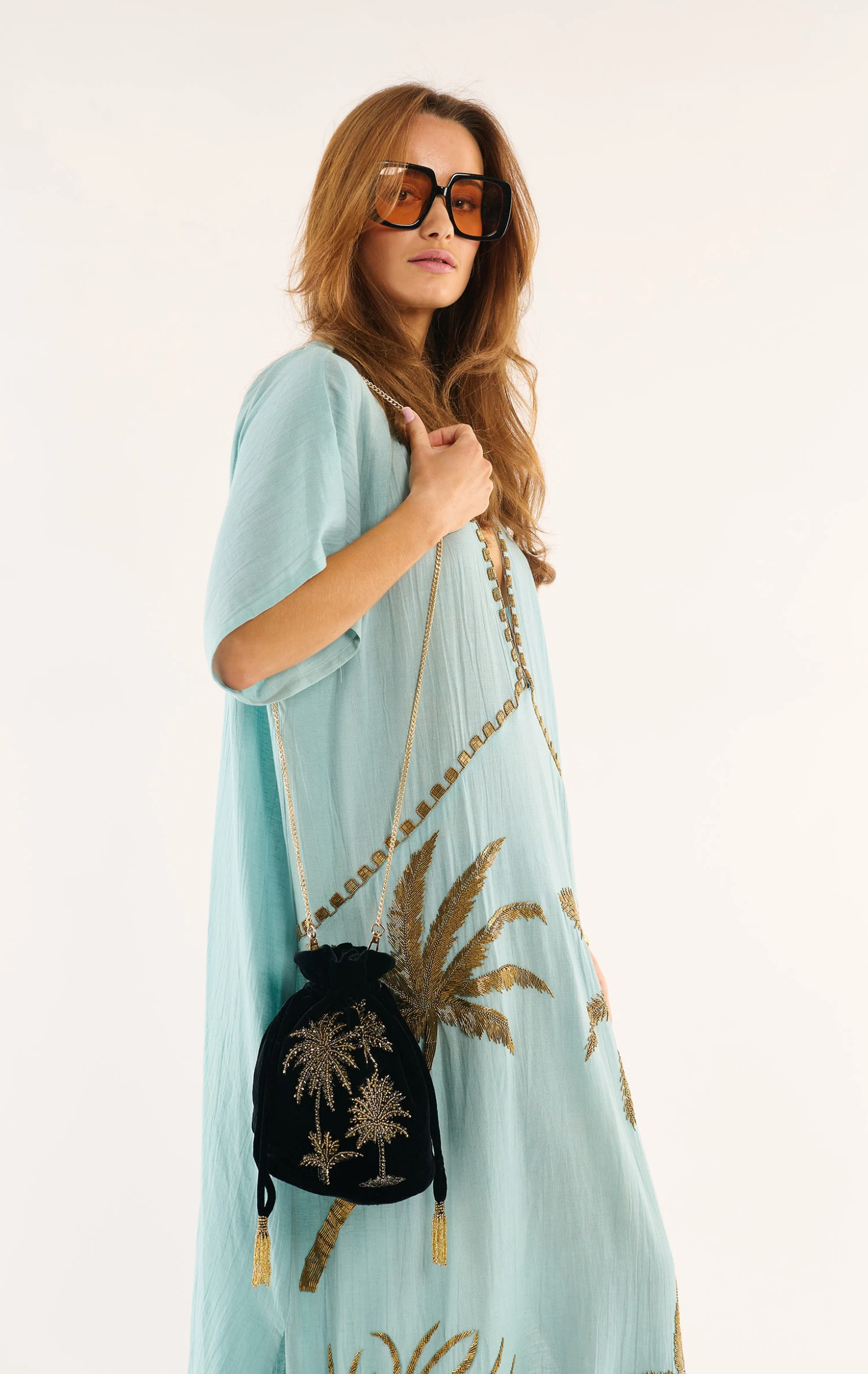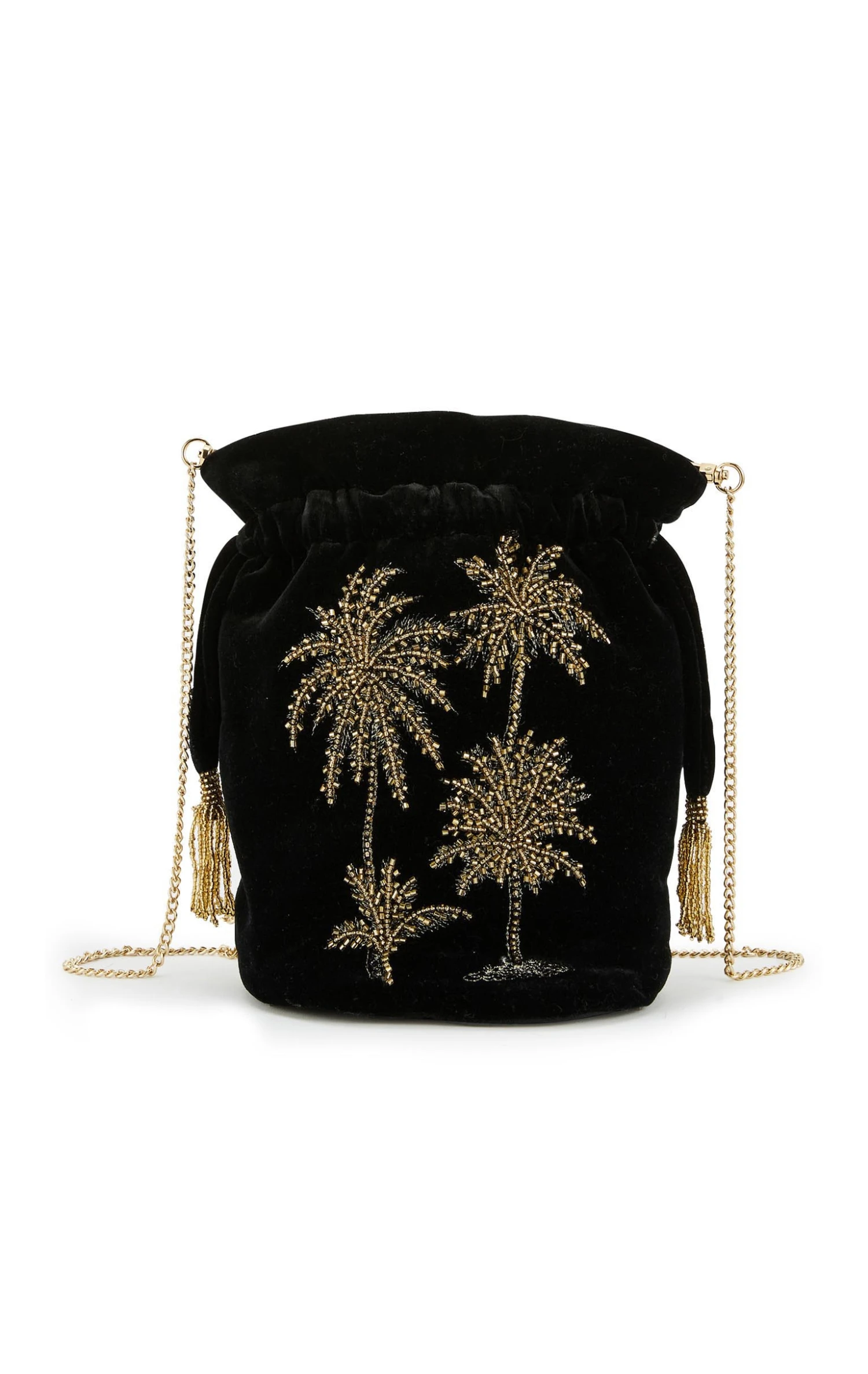 Notre sac Aphelios est un sac seau, retravaillé autour d’une forme bourse, qui se porte en bandoulière grâce à une précieuse chaîne dorée. Sur un fond en velours noir profond, se dessinent nos magnifiques palmiers, entièrement brodés de perles dorées. Aphelios se ferme grâce à des cordons que l’on resserre et qui se terminent par d’exquises petites perles dorées pour parfaire ainsi le caractère iconique de cet accessoire parfait.