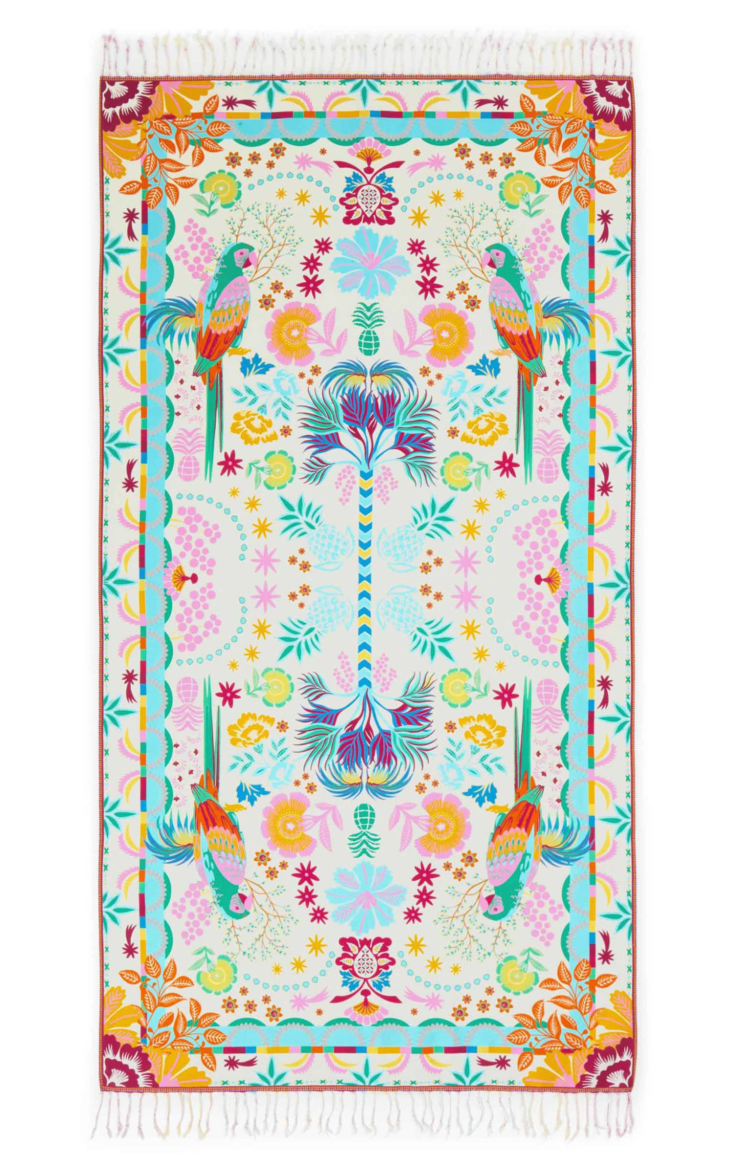 La fouta indispensable pour l’été! WILD décline son univers féminin et bohème avec cette grande serviette de bain en coton un peu épais. Ornée de petites franges, elle reprend le thème de notre foulard Babouchka: un paysage luxuriant, un peu idyllique, entre l’Inde et le Brésil avec des palmiers, des perroquets, de fleurs de Paradis, des ananas, des étoiles filantes. Elle se décline ici sur fond beige, avec des éléments multicolores turquoise, rose, rouge, orange, violet.