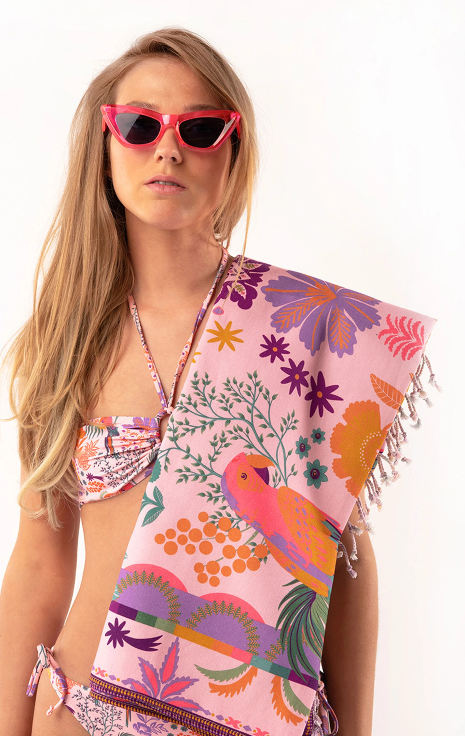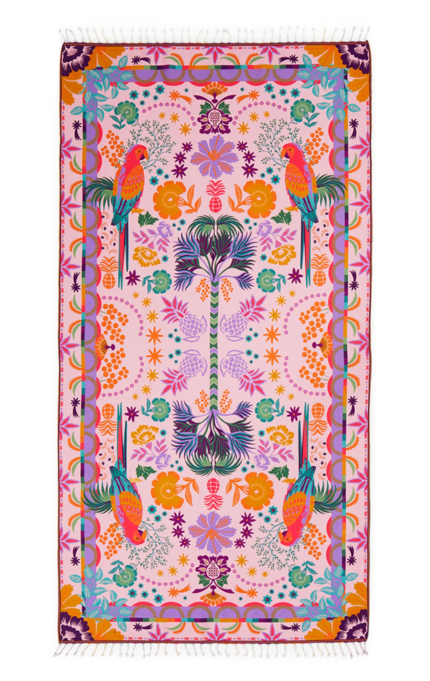 La fouta indispensable pour l’été! WILD décline son univers féminin et bohème avec cette grande serviette de bain en coton un peu épais. Ornée de petites franges, elle reprend le thème de notre foulard Babouchka: un paysage luxuriant, un peu idyllique, entre l’Inde et le Brésil avec des palmiers, des perroquets, de fleurs de Paradis, des ananas, des étoiles filantes. Elle se décline ici sur fond rose, avec des éléments multicolores, des couleurs franches mais désaturées pour une touche vintage.
