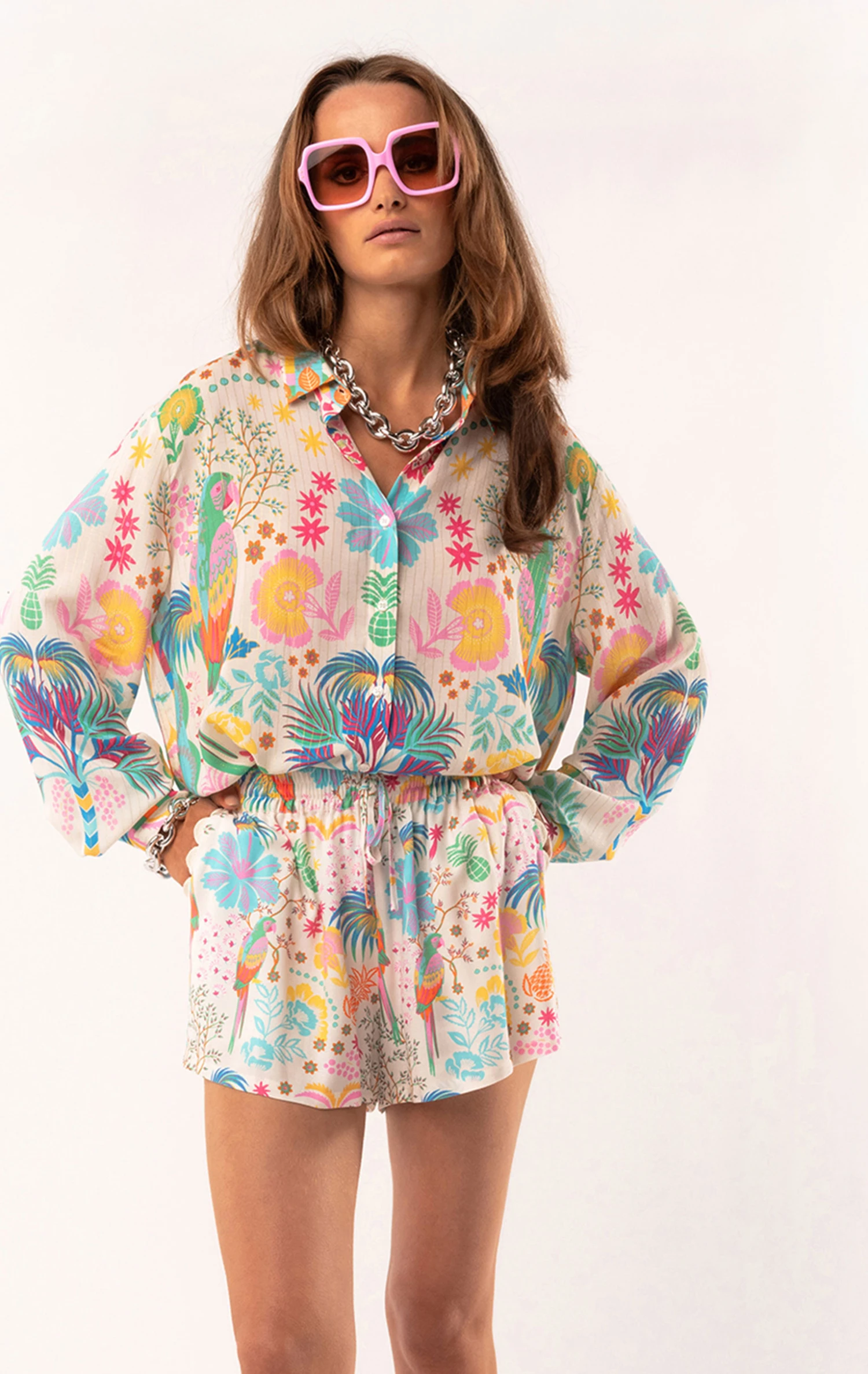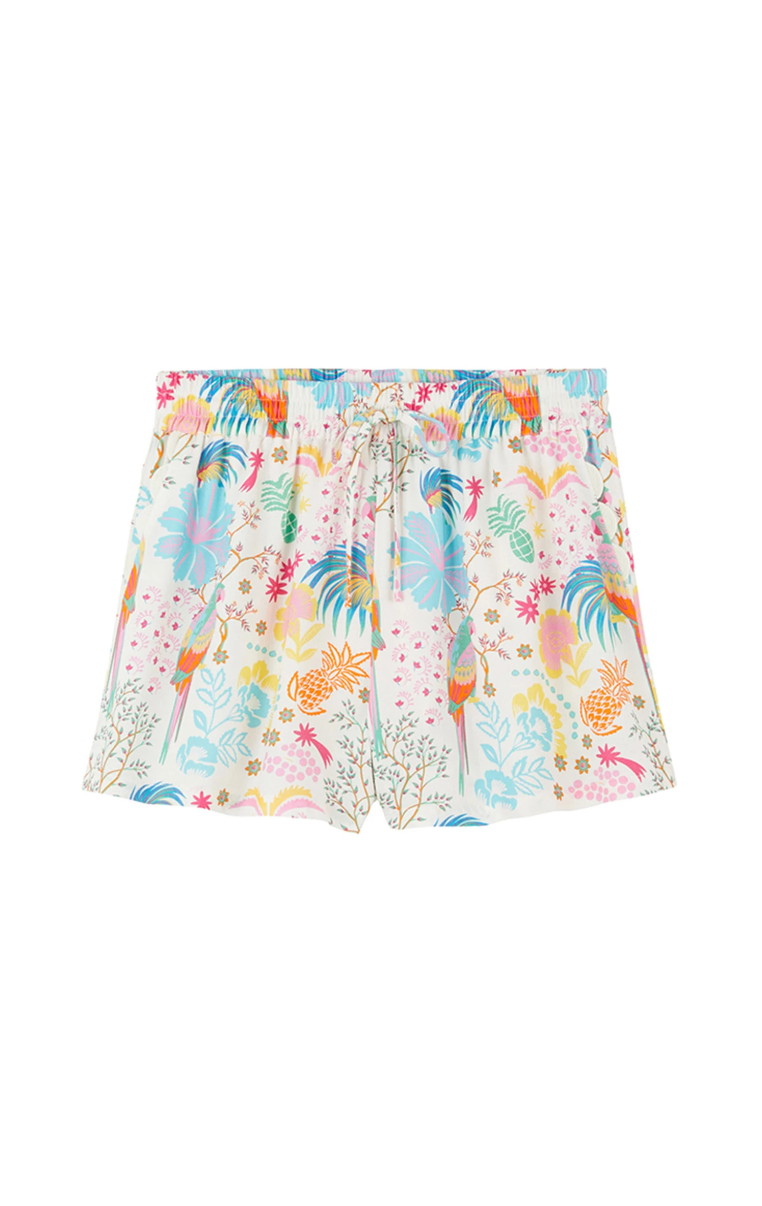 Le short à shopper pour les beaux jours! Dans cette matière crêpe de rayonne hyper confortable et légère mais sans être transparente, ce short décline l’imprimé Babouchka en blanc et multicolore. Très confortable, il est élastiqué à la taille, resserrable avec un petit cordon, avec une jambe un peu évasée. On adore les poches rehaussées d’un détail croquet pour un effet très bohème.