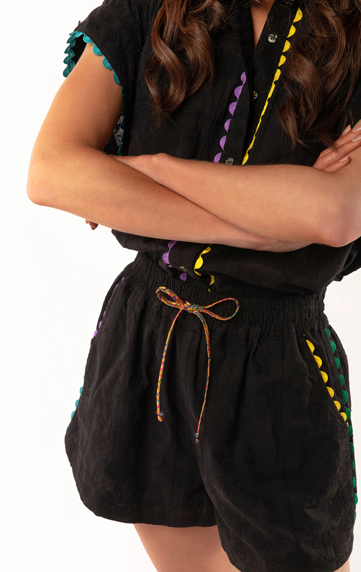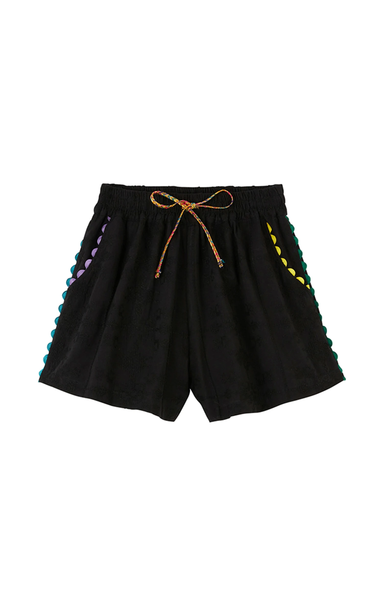 Le parfait petit short noir, élastiqué à la taille avec un ruban multicolore arc-en-ciel pour un confort absolu. Rebrodé au point de croix, orné de galons croquets serpentines jaune et violet sur les poches, turquoise et vert sur les côtés des hanches. À assortir à la chemisette Buddy pour un total-look twin-set.