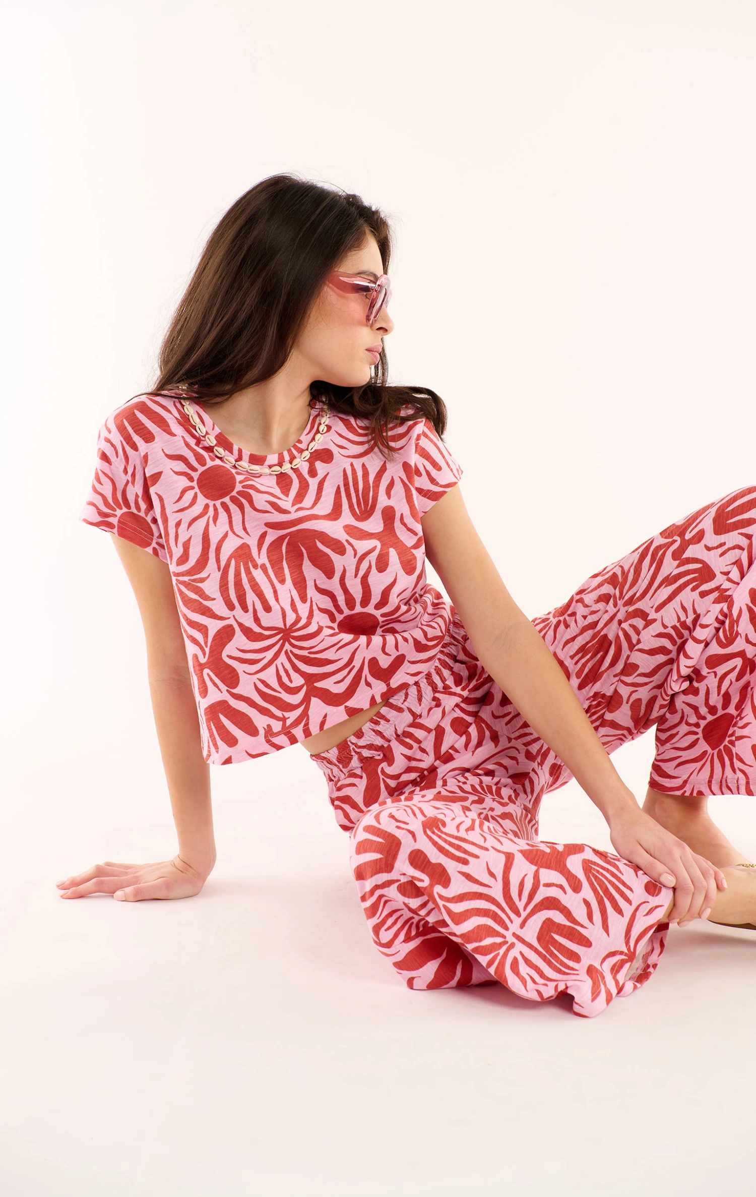 Dans ce petit thème jersey, nous sommes plongés dans un été où confort et féminité se marient harmonieusement avec des imprimés ensoleillés. Le top Amandine, fabriqué dans un jersey flammé rose, est orné de motifs solaires et floraux de couleur brique. De forme large et court, il est très facile à porter tandis que son encolure retravaillée est brodée de petits coquillages cori et évoque, ainsi, l’été qui arrive…