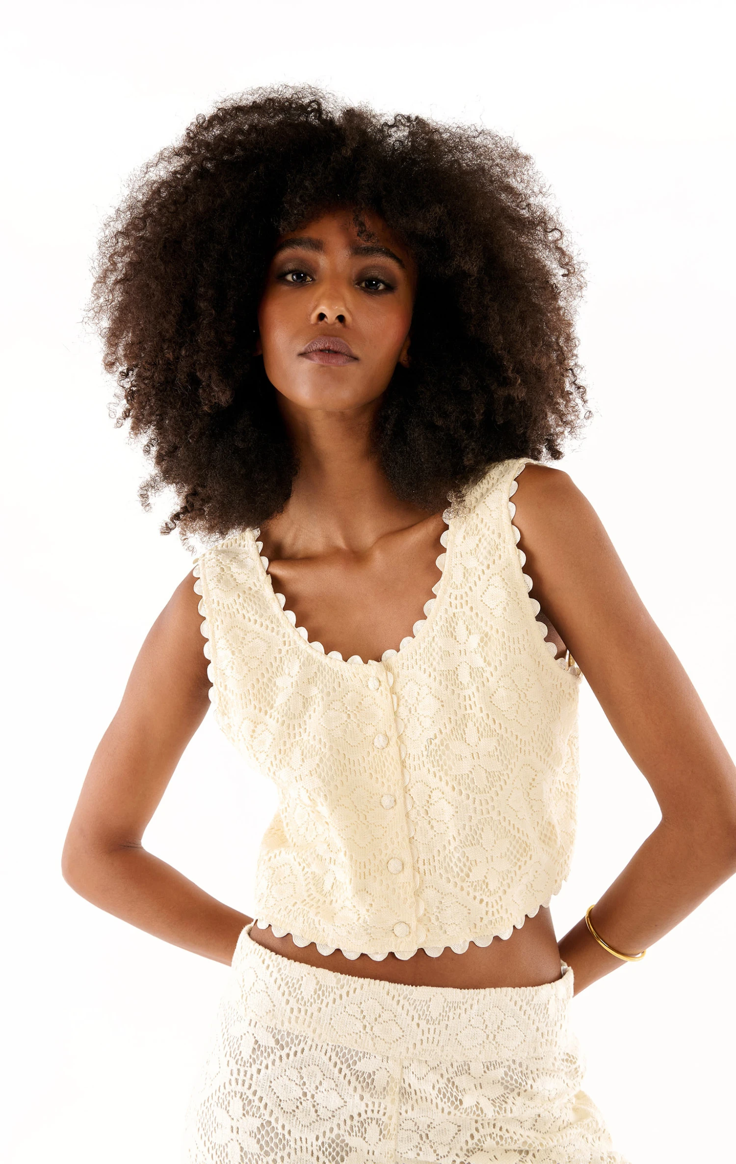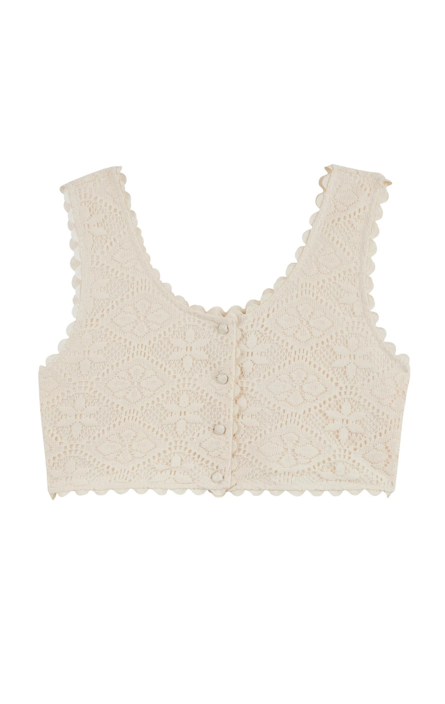 Confectionné en léger crochet dentelle, Hedda se boutonne sur toute sa longueur par d’adorables boutons recouverts. Son décolleté, à l’arrondi parfait, et ses larges bretelles dévoilent, avec une élégance très féminine, notre peau hâlée des mois d’été. Gansée d’un ravissant croquet sur son encolure, son emmanchure et son bas de vêtement, Hedda se porte en twin-set avec notre pantalon Kayle ou, pour un look plus décalé, sur un short en jean. Il se décline en trois couleurs : blanc cassé, noir et vert menthe.
