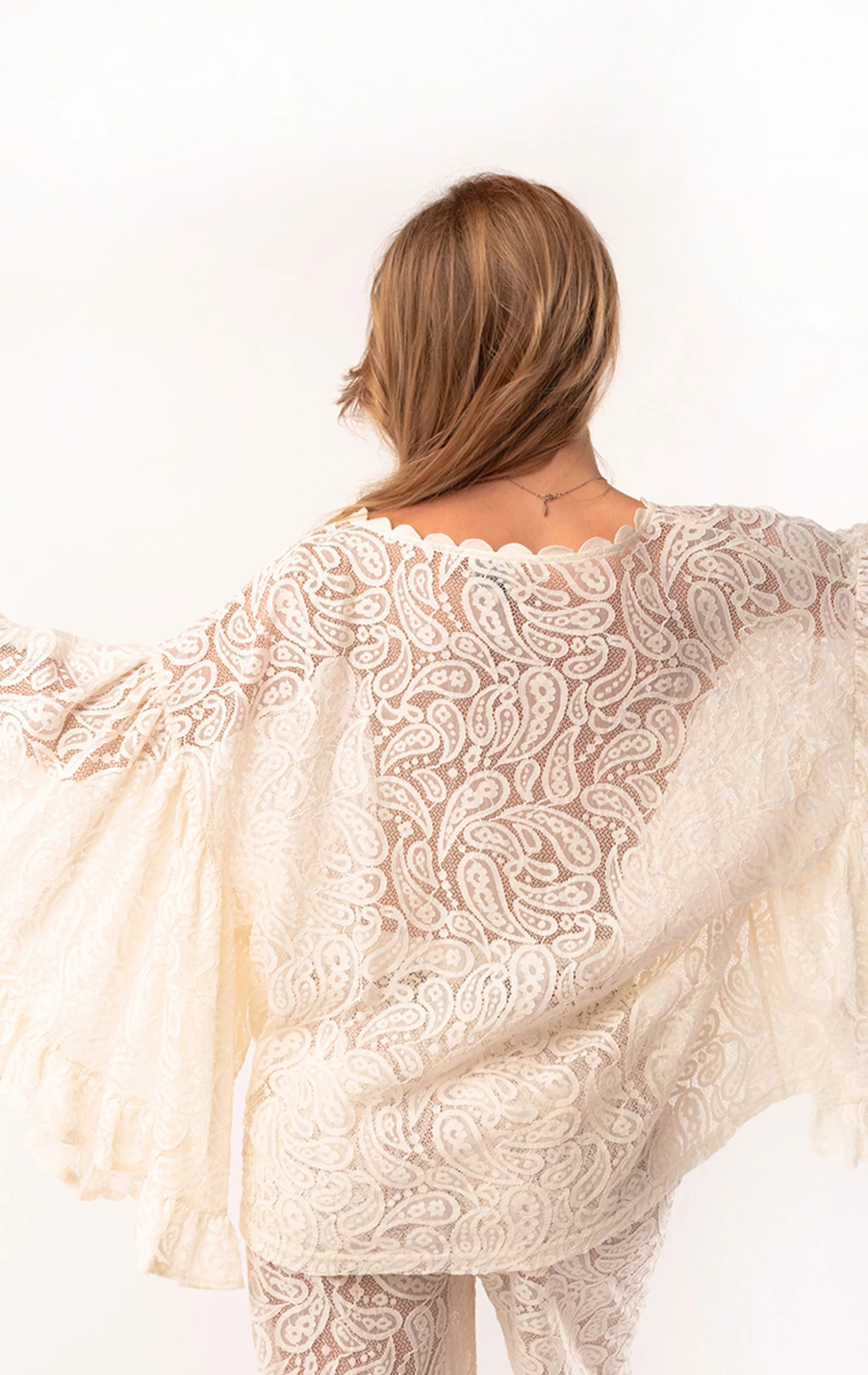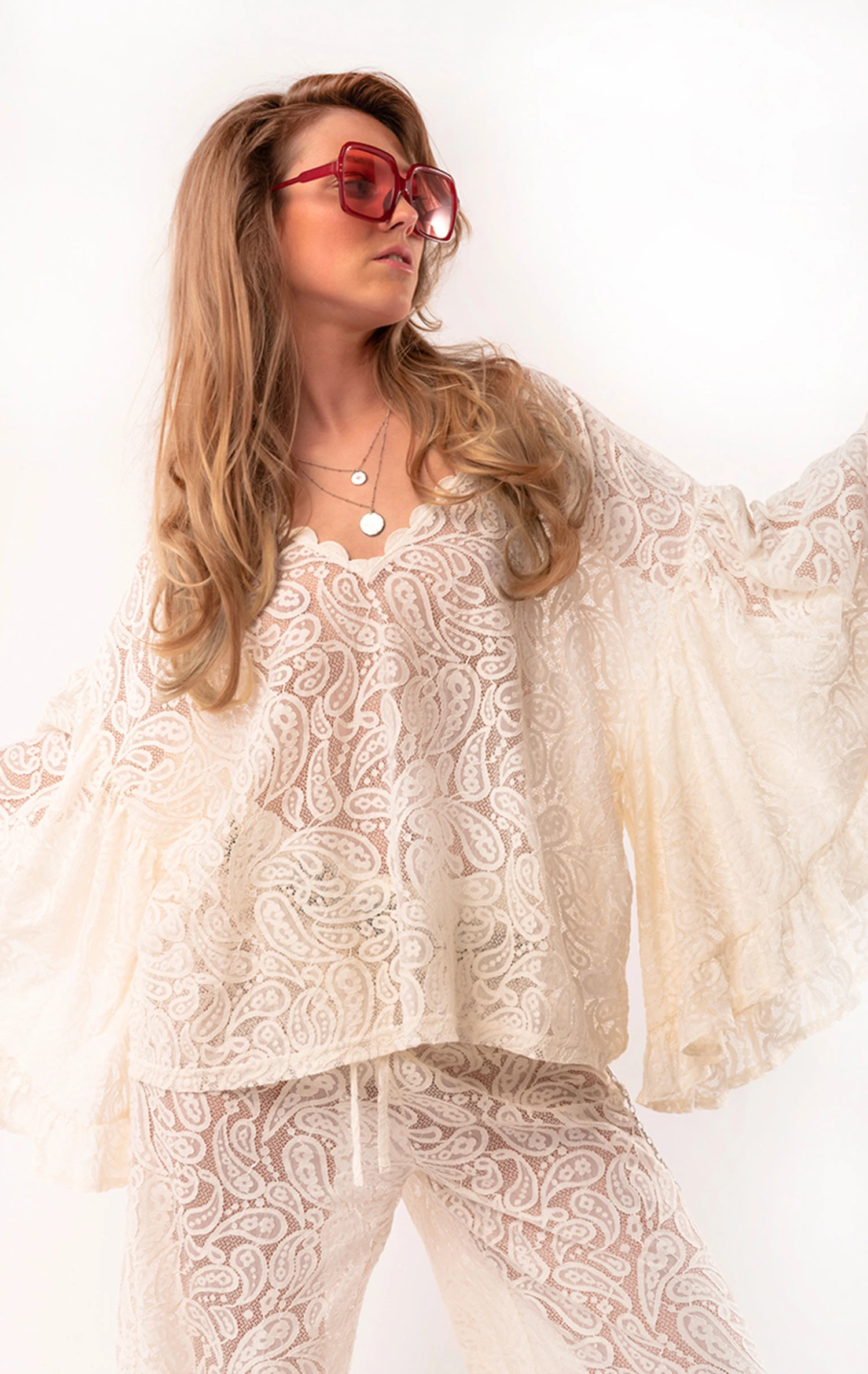 Bohème et sexy à la plage avec WILD! On joue sur la transparence de matières délicates avec notre blouse Pepino blanche, aux ravissants motifs cachemire. Avec son profond décolleté en V ourlé de détails en croquet, on aime la féminité baby-doll de cette silhouette seventies avec ses manches larges volantées. À porter en total-look avec le pantalon Segura.