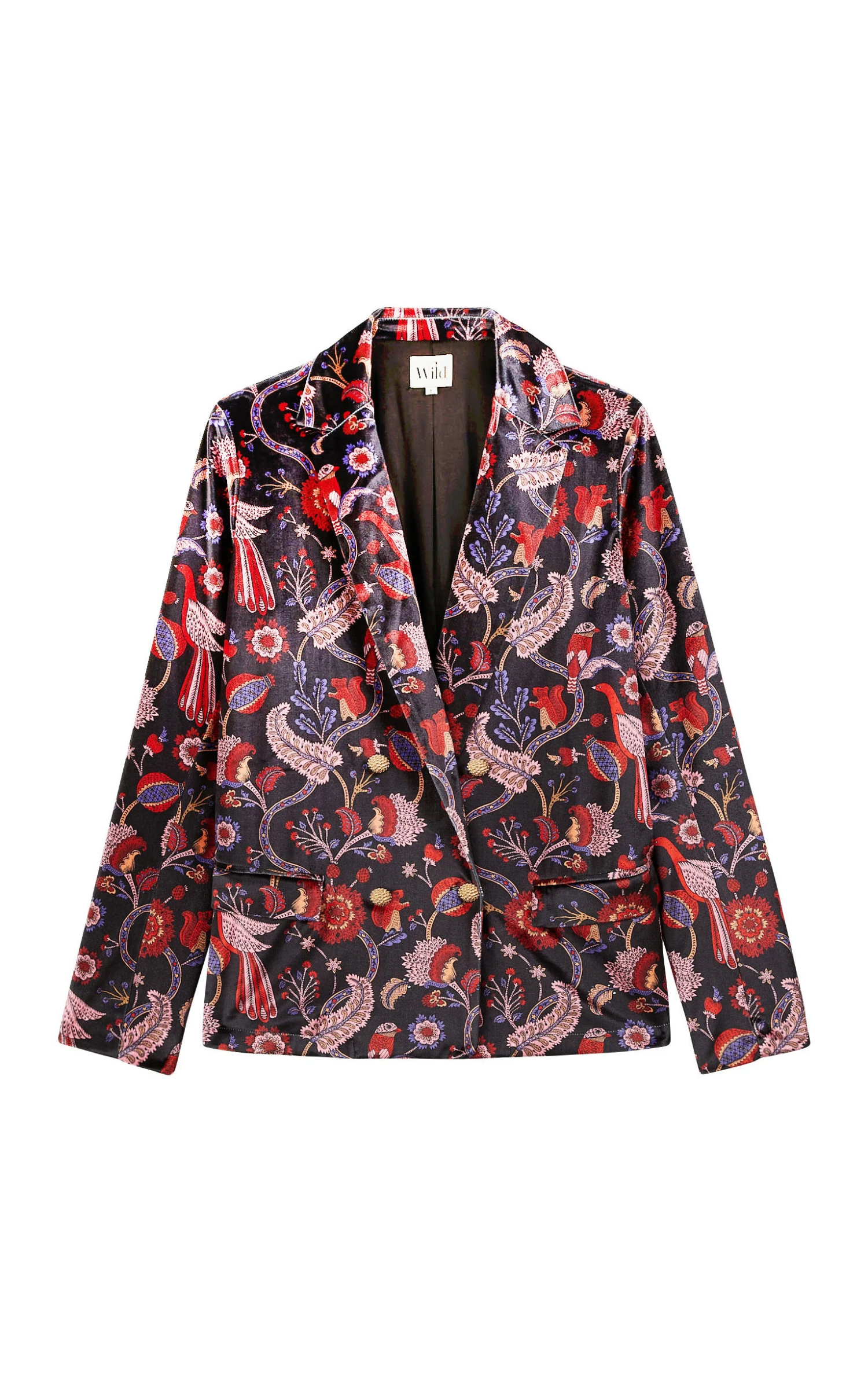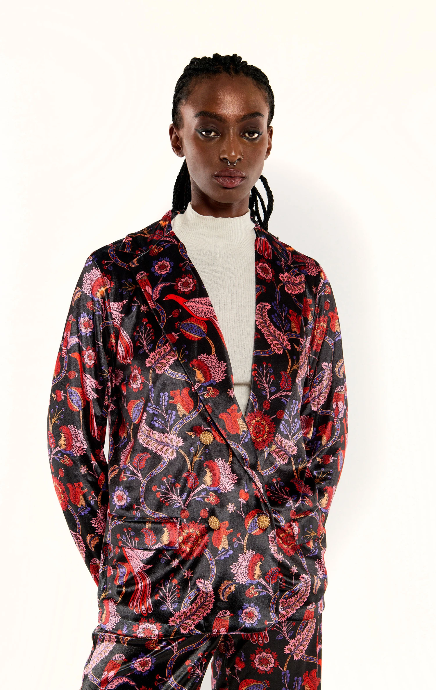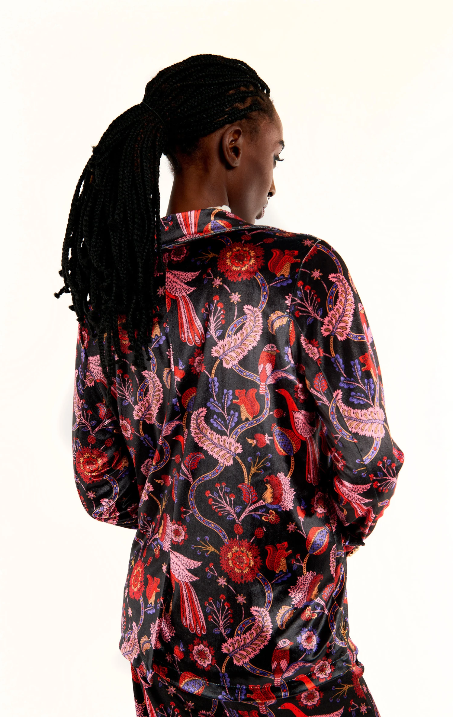 Confectionnée en velours ras noir, elle arbore un exotique imprimé all over sur lequel se dessinent des motifs cachemire et d’incroyables oiseaux de paradis aux nuances rouges, roses et violettes. Très féminine et versatile, elle se marie avec toutes les pièces de notre vestiaire, pour un look casual ou sophistiqué. Elégamment structurée avec ses poches passepoilées à rabat, elle se ferme grâce à de précieux boutons ouvragés. Et pour un total look 70’s, on s’amuse à l’assortir avec le pantalon Calista.