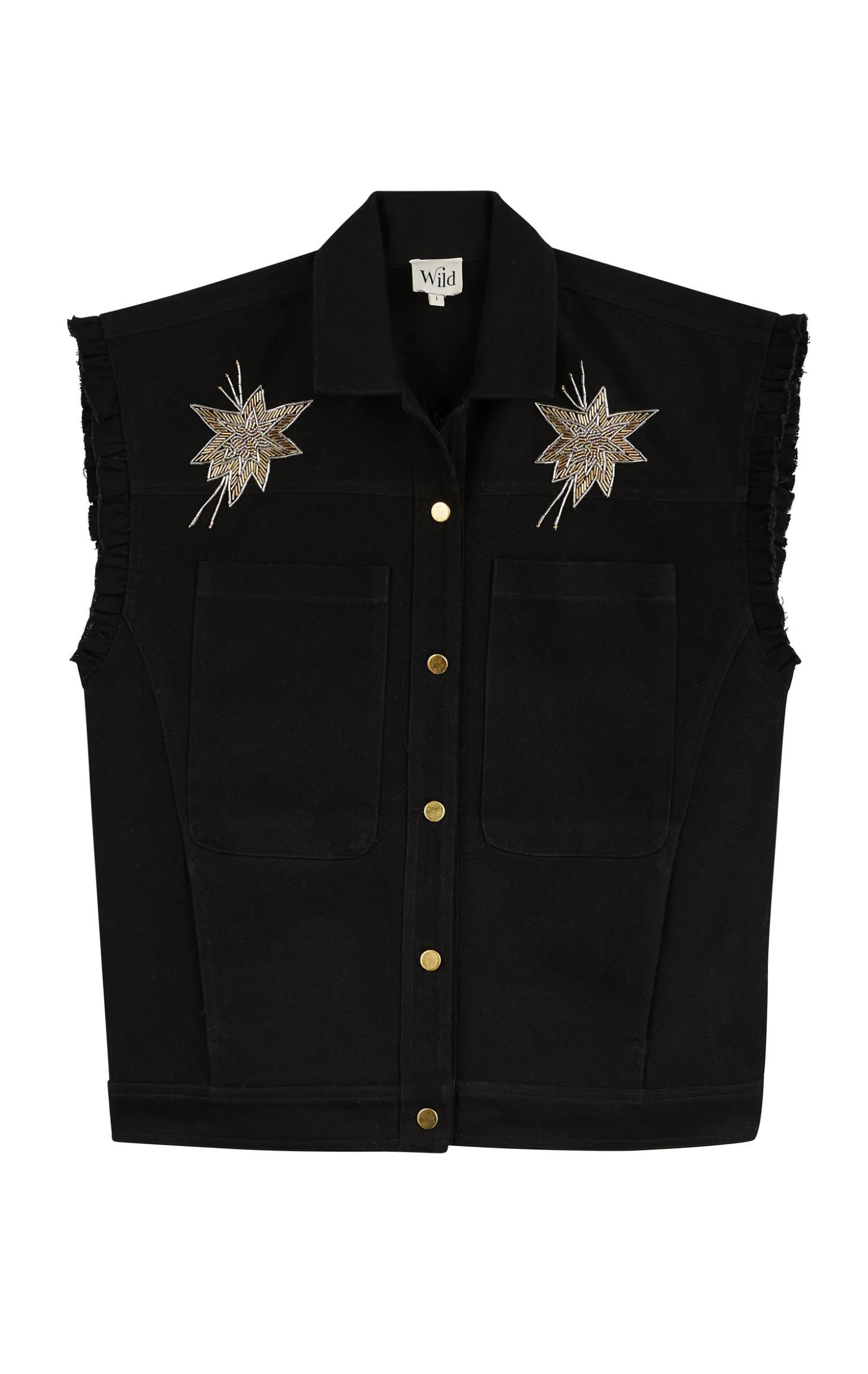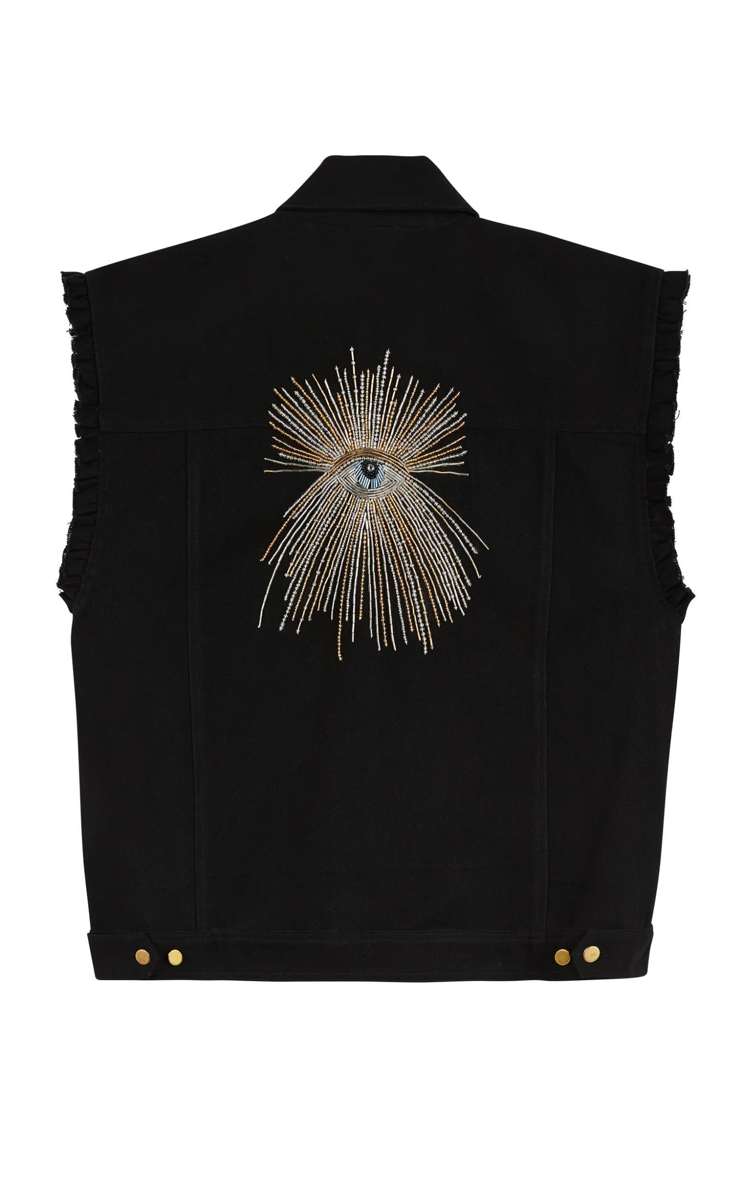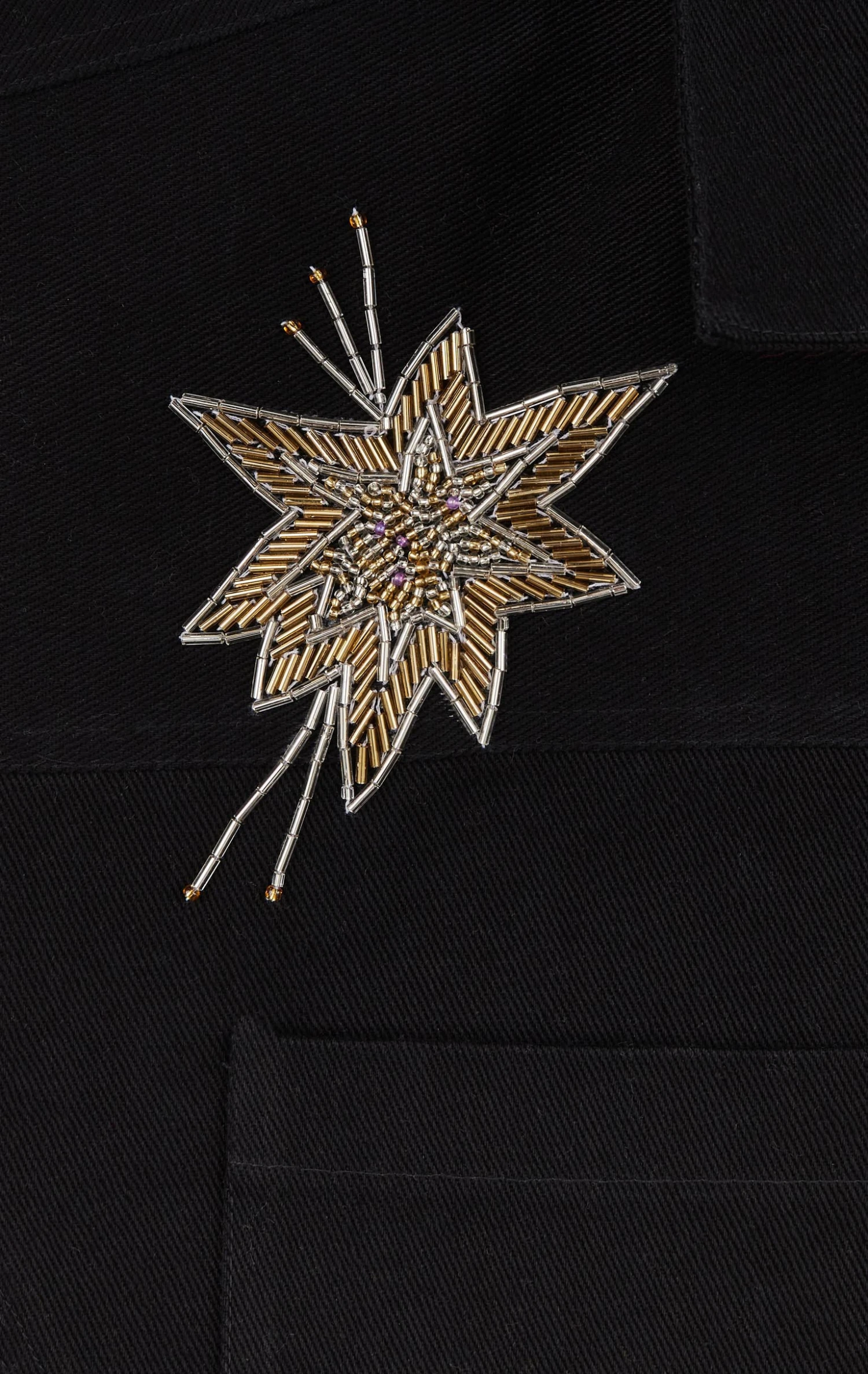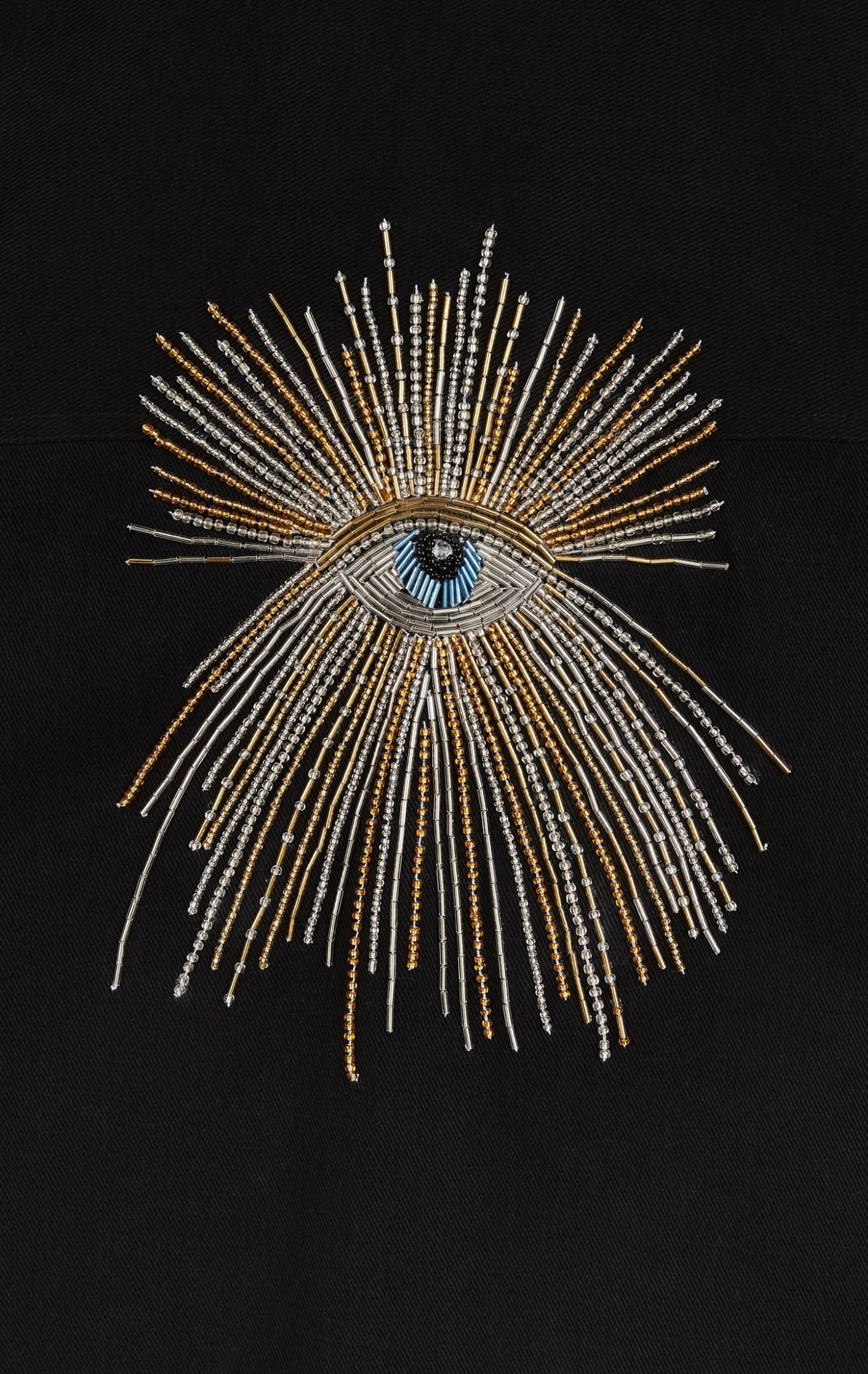En noir surteint, la veste Alma se pare d’une teinte profonde sur laquelle se dessinent les symboles iconiques de notre imprimé Comète : deux étoiles brodées sur chacune des épaules et notre emblématique œil protecteur brodé dans le dos.