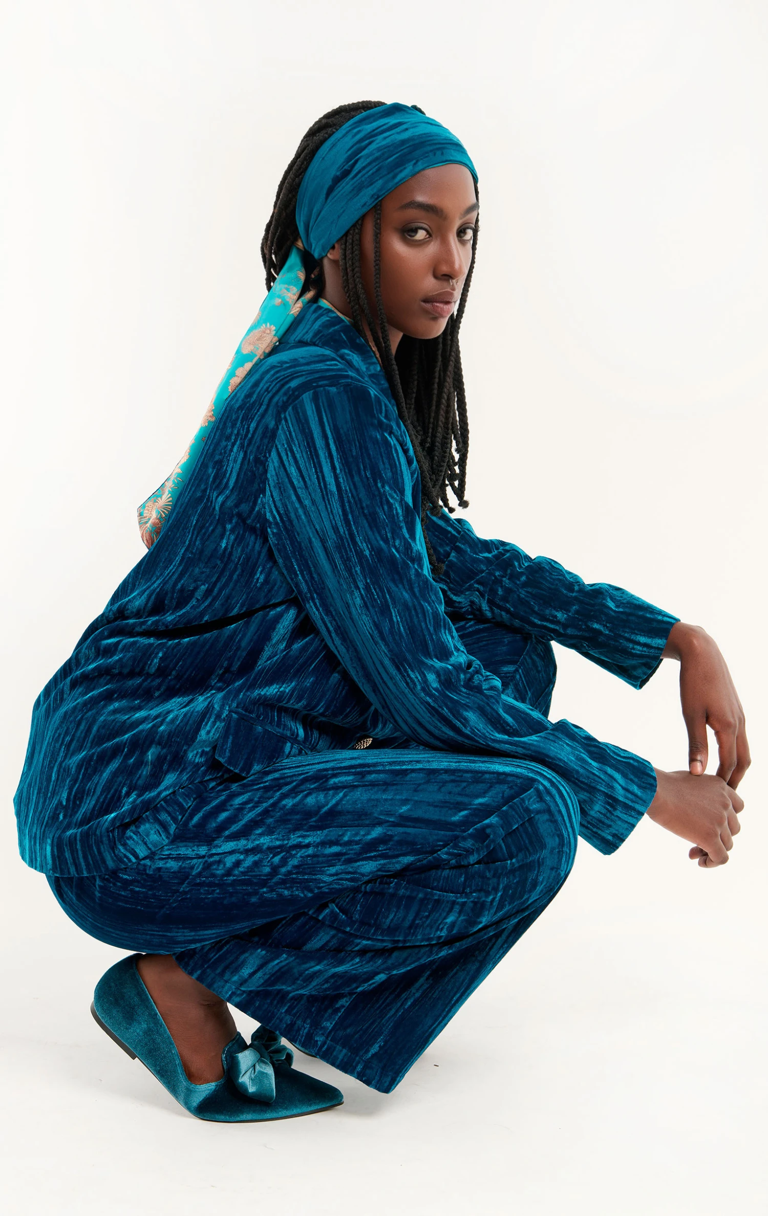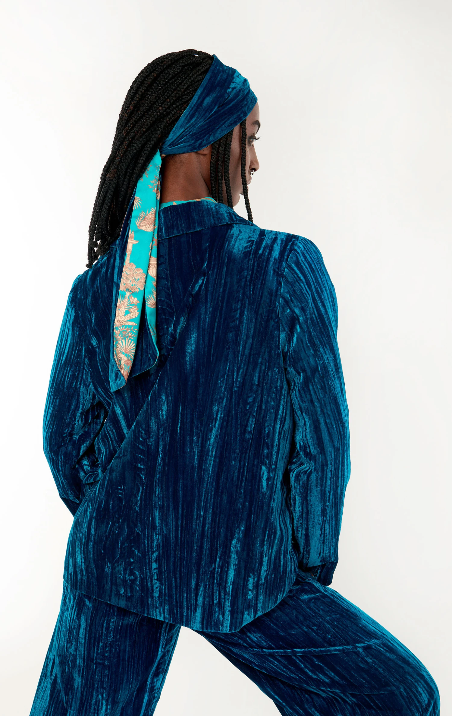 Sa matière, un velours souple apporte avec subtilité, un peu de volume à sa coupe droite, inspirée tailleur, pour un look chic et décontracté. Notre imprimé emblématique Jaipur s’est glissé en all over dans la doublure et apporte une douce sophistication à l’ensemble lui même structuré par deux poches passepoilées avec rabat. Associée au pantalon assorti Koffi, elle se pare d’une élégance rétro exceptionnelle. Elle se décline en 5 couleurs, ici dans un velours bleu pacifique et canard profond.