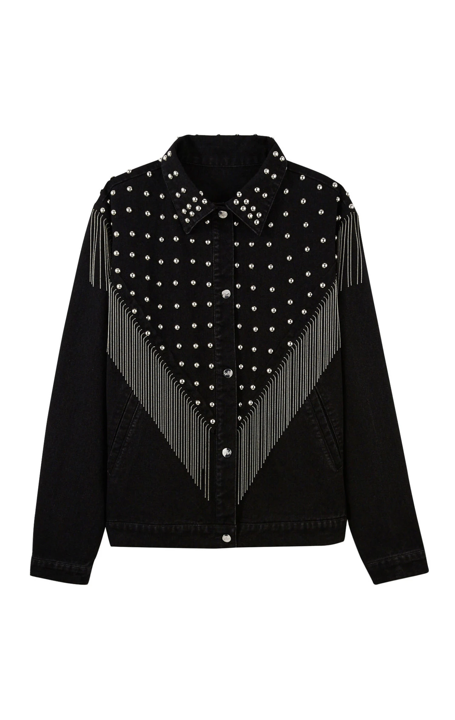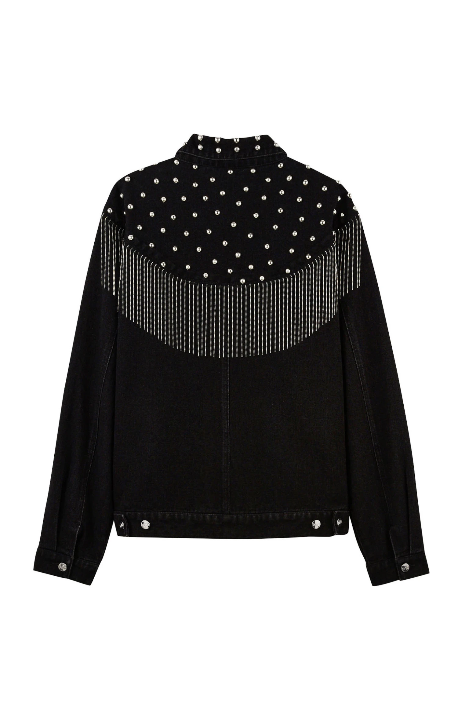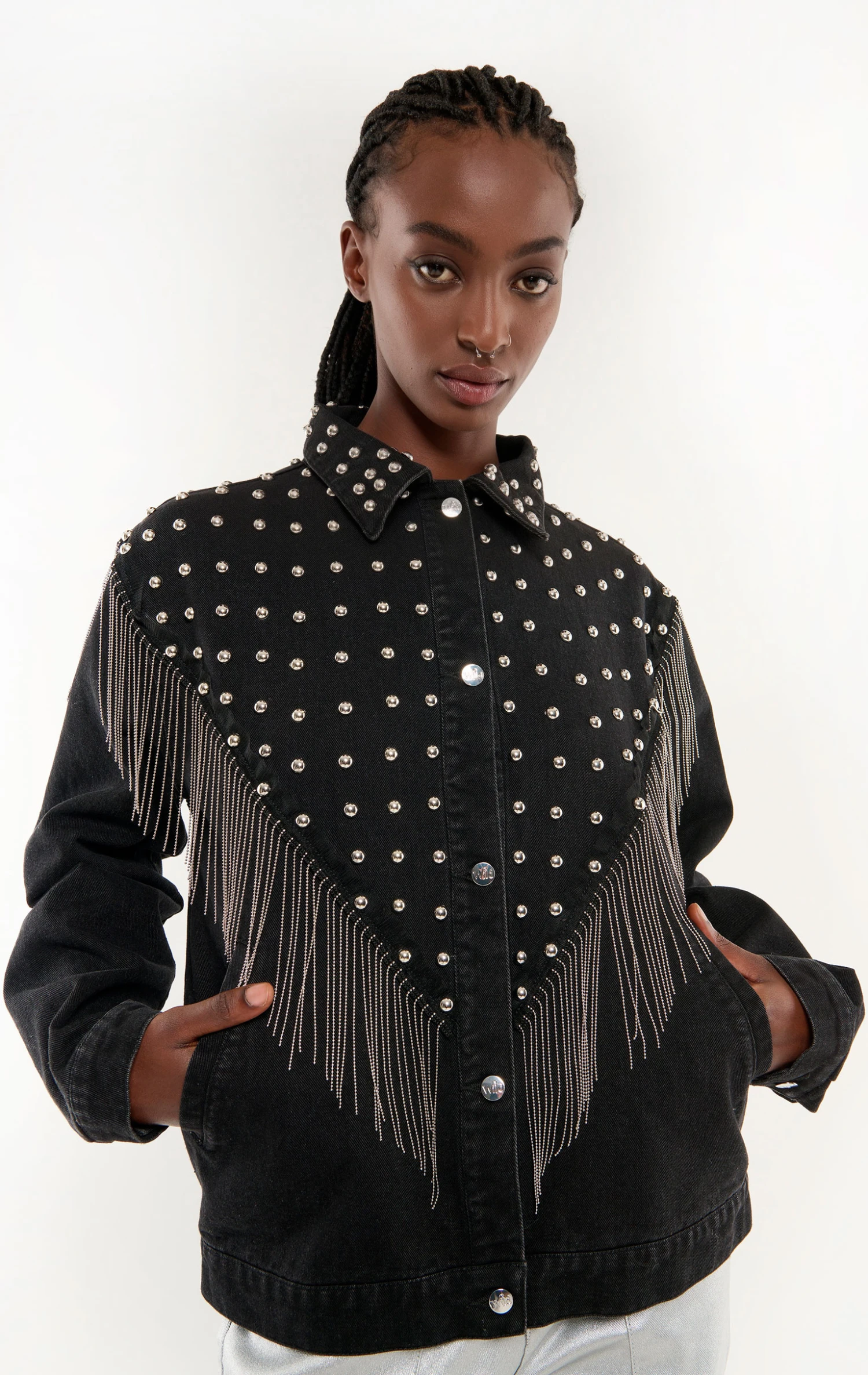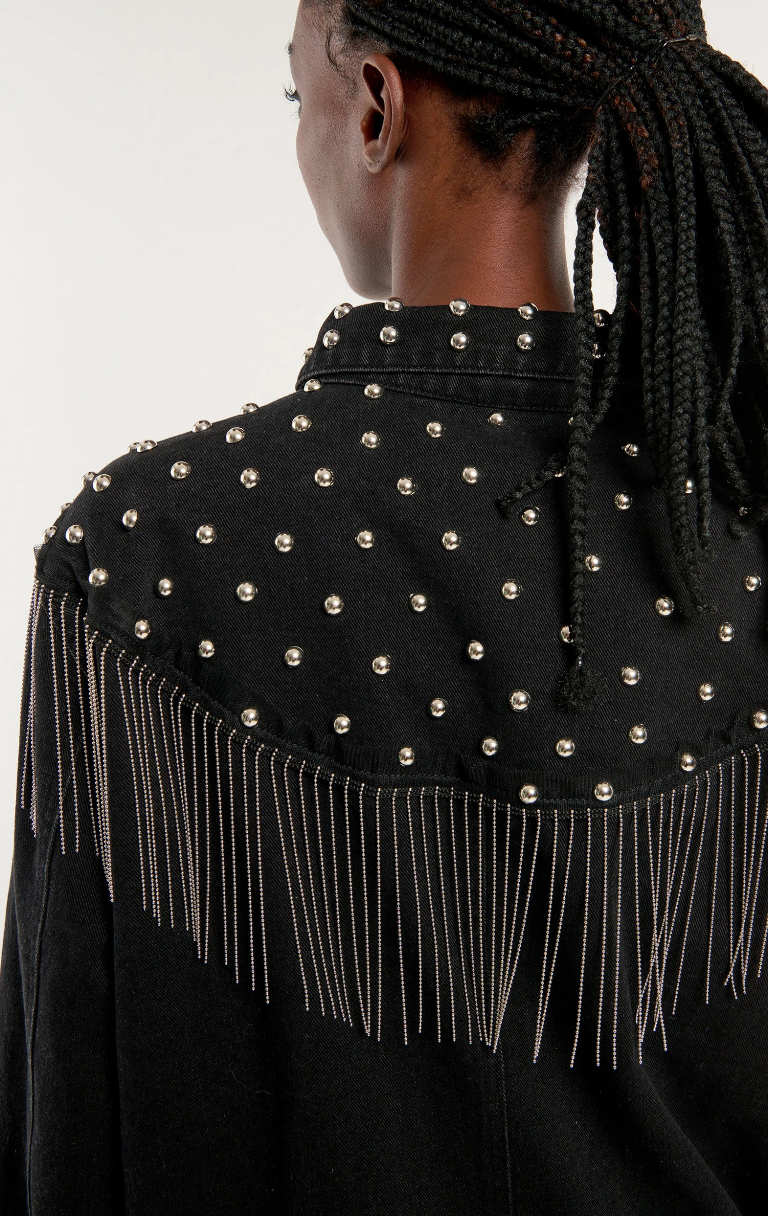 Cette veste oversize en jean noir s’approprie les codes des motards des années 80, les déployant en version XXL : d’imposants clous argentés ornent son col et se dessinent en pointe sur le devant, tandis que de longues franges argentées en lurex forment un V imposant. Assez longue et oversize, Luz est la veste Rock de l’hiver, à porter sur un gros pull ou sur un sweat à capuche pour un look décalé.