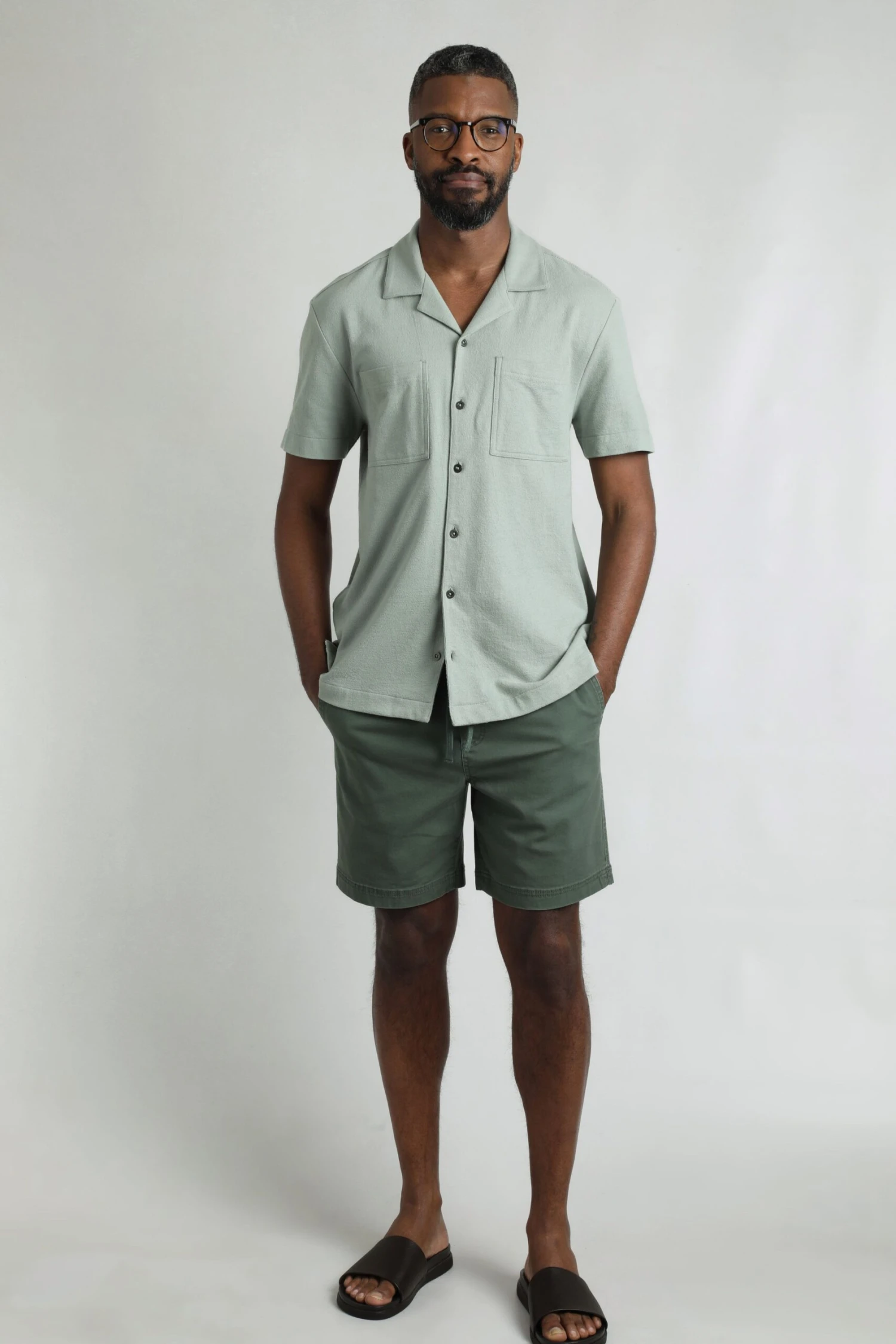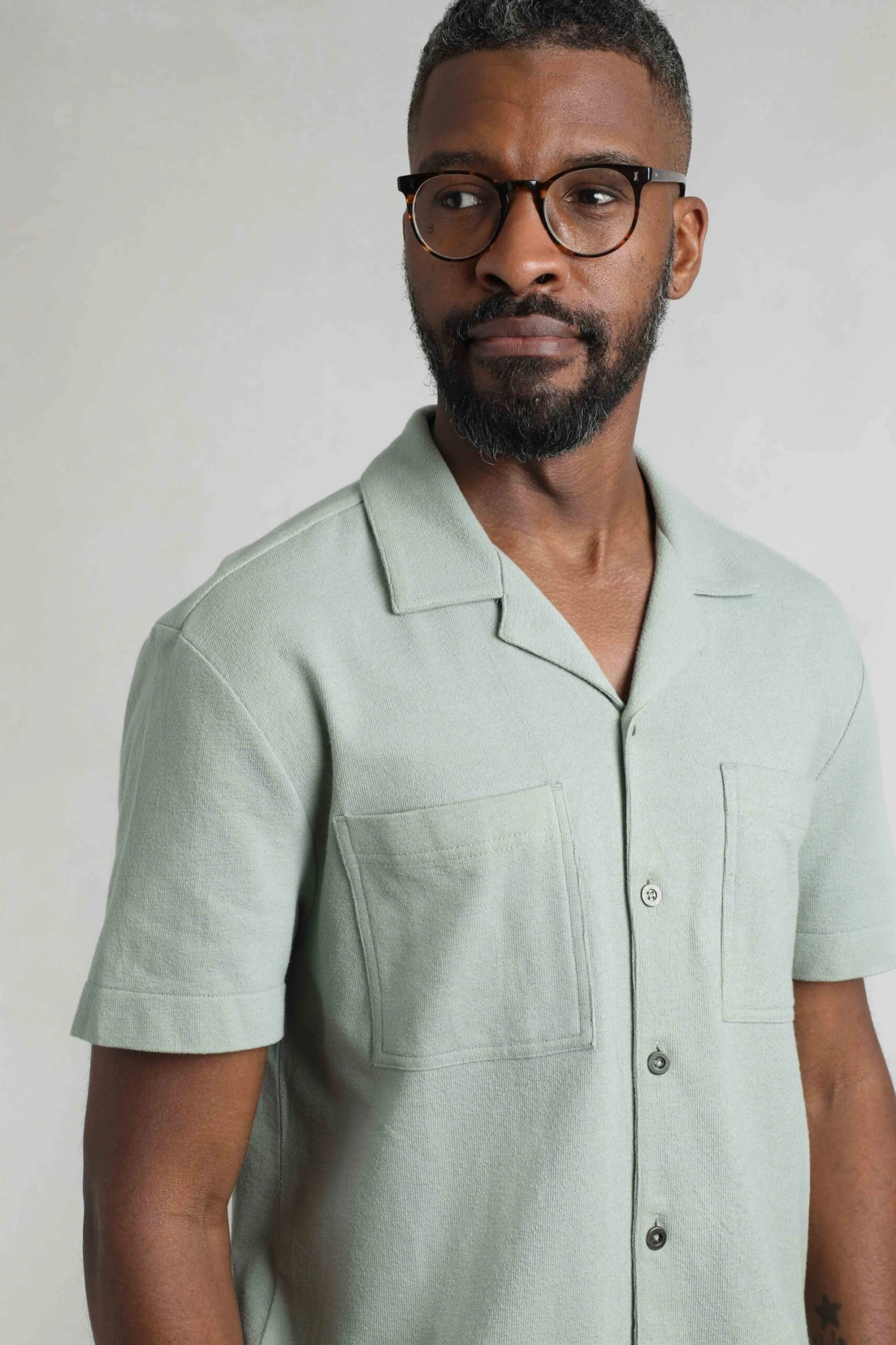 A new texture for us, the Wooster Crepe Knit Shirt is soft and drapes like jersey, but with a very fine knit texture. We have added a Cuban collar for a holiday feel, and finished it with metal buttons and chest pockets. This wearable colour teams well with plenty of options this season.